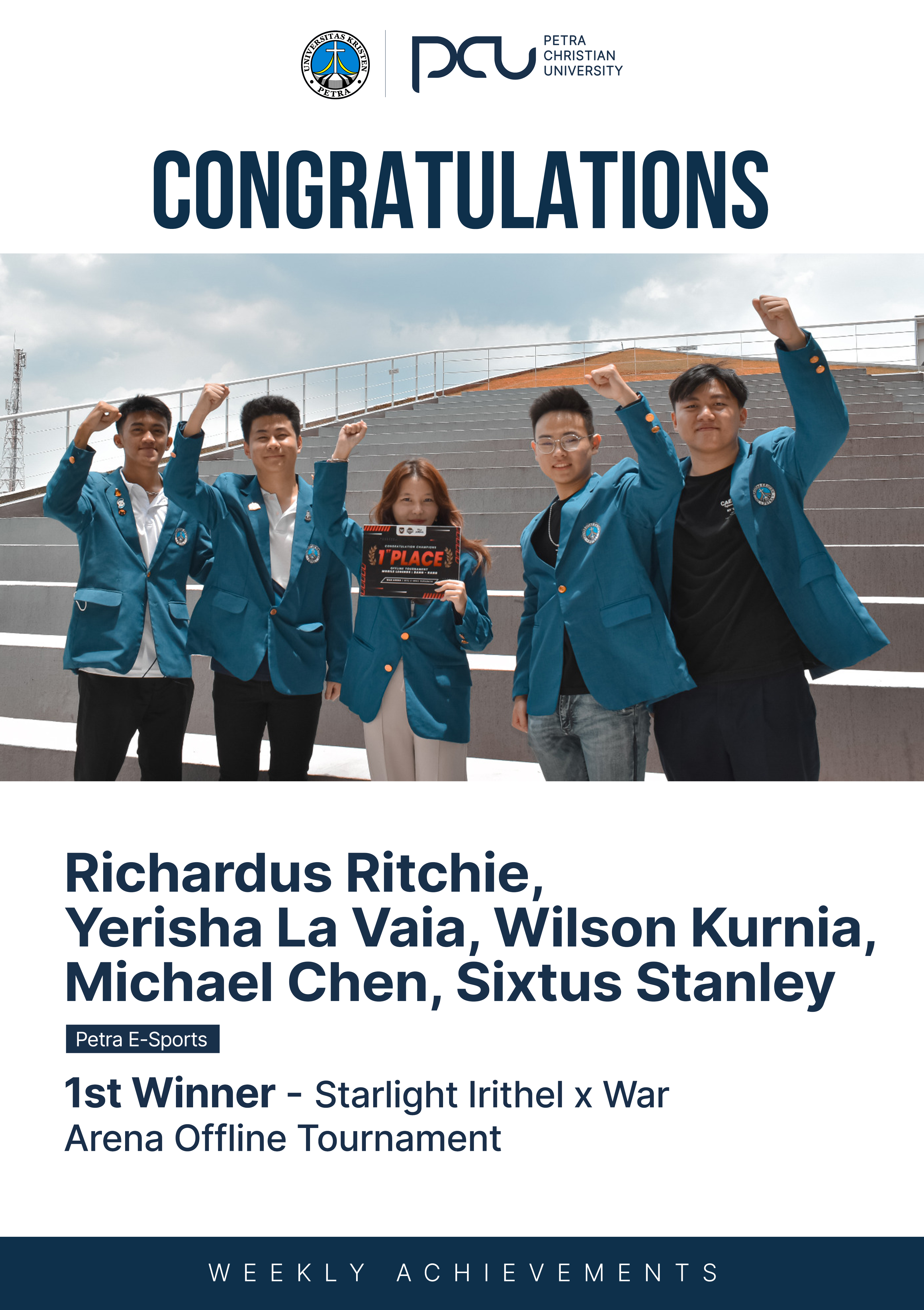 Selamat atas prestasi yang diraih oleh Richardus Ritchie, Yerisha La Vaia, Wilson Kurnia, Michael Chen, Sixtus Stanley sebagai 1st winner dalam Starlight Irithel x War Arena Offline Tournament.