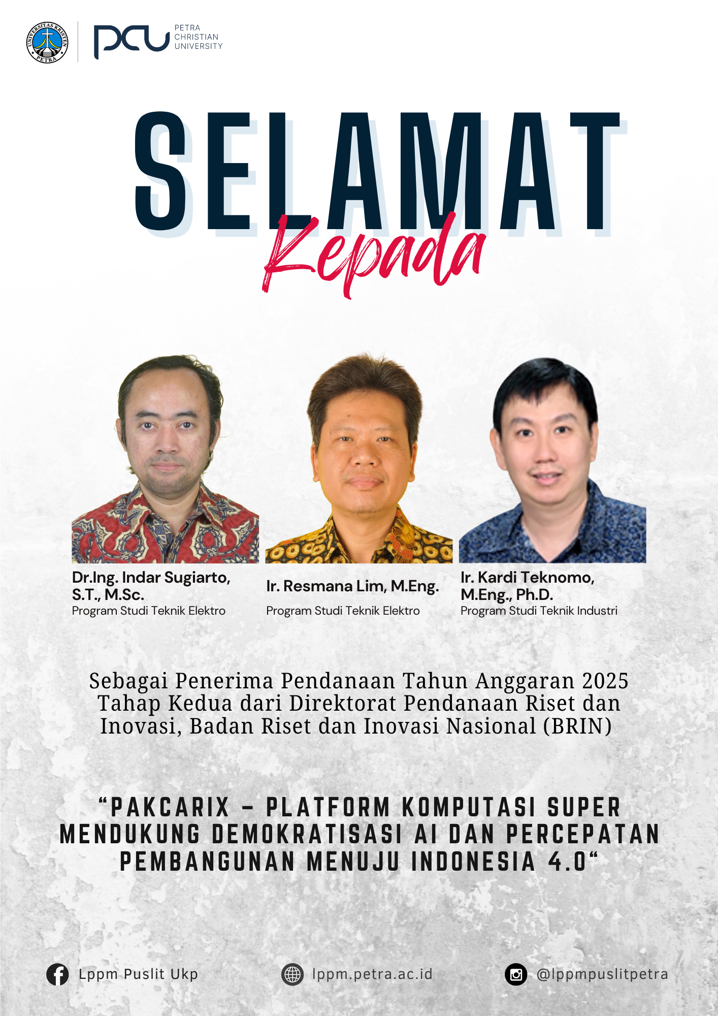 Selamat atas prestasi yang telah diraih Dr.Ing.Indar Sugiarto, Ir. Resmana Lim, M.Eng., Ir.Kardi Teknomo, M.eng., Ph.D. sebagai penerima pendanaan tahun anggaran 2025 dari Badan Riset dan Inovasi Nasional (BRIN).