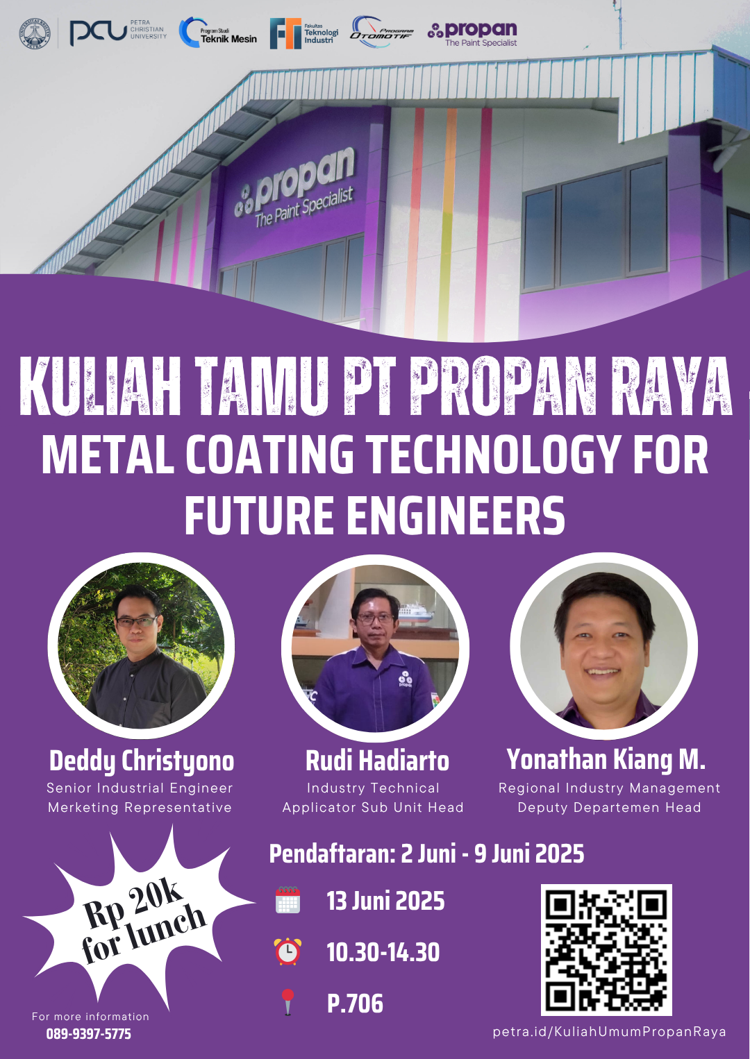 Program Studi Teknik Mesin Universitas Kristen Peytra Surabaya mengadakan acara kuliah tamu. Acara ini merupakan inisiasi dari PT Propan Raya untuk mengadakan pembelajaran bagi mahasiswa PCU dengan tema Metal Coating Technology for Future Engineers. Tidak hanya pembelajaran teori yang membosankan, namun akan terdapat pula sesi praktik yang menarik. Acara ini akan dipimpin oleh 3 pengajar dari PT Propan Raya.