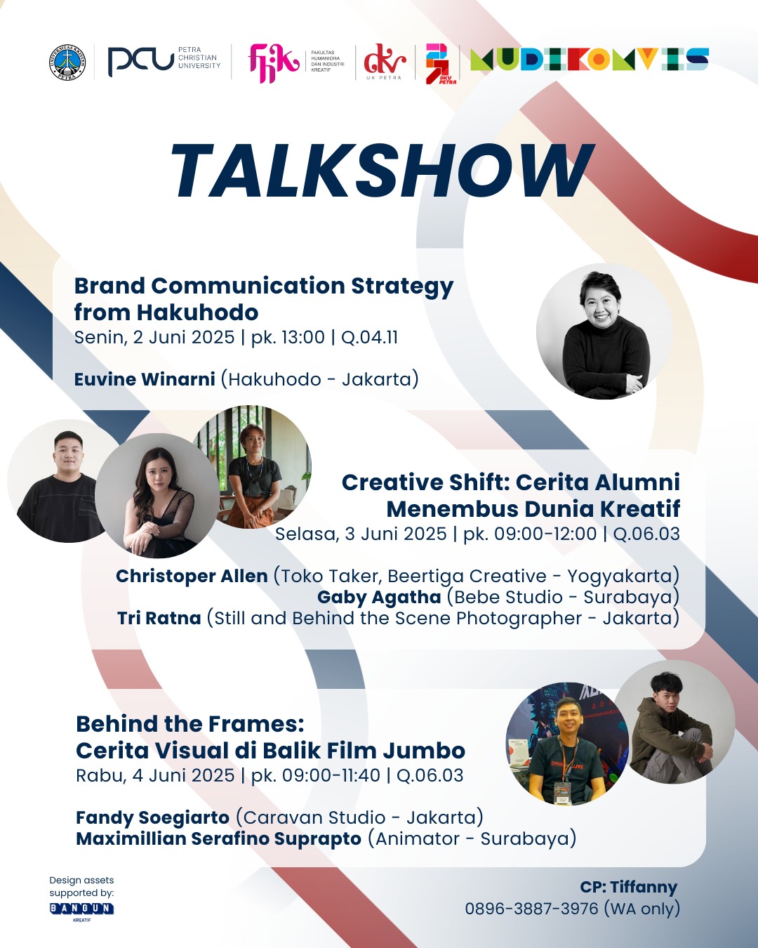 Didalam memeriahkan dies natalis Program Studi Desain Komunikasi Visual UK Petra. Akan diselenggarakan beberapa acara talkshow. Pada tanggal 02 Juni 2025 jam 13.00 WIB bertempat di Q.04.11 diselenggarakan talkshow dengan tema Brand Communication Strategy From Hakuhodo dengan narasumber Euvine Winarni. Sedangkan pada tanggal 03 Juni 2025 jam 09.00 -12.00 WIB bertempat di Q.06.03 akan diselenggarakan acara talkshow dengan topik Creative Shift: Cerita Alumni Menembus Dunia Kreatif. Dan pada tanggal 04 Juni 2025 jam 09.00 - 11.45 WIB bertempat di Q.06.03 akan doiselenggarakan acara talkshow dengan tema Behind the Frames: Cerita Visual di Balik Film Jumbo.