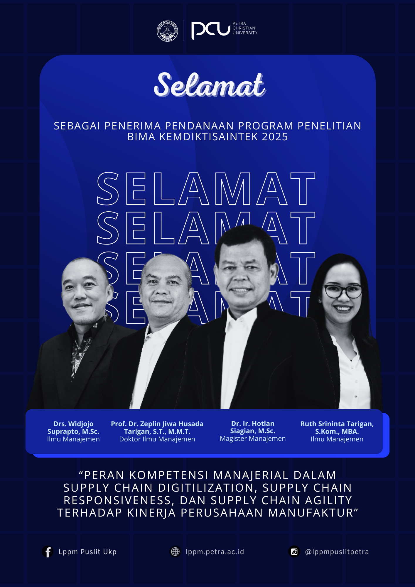 Selamat atas prestasi yang diraih oleh Widjojo Suprapto, M.Sc., Prof. Dr. Zeplin Jiwa Husada Tarigan, Dr. Hotlan Siagian, Ruth Srininta Tarigan, MBA.