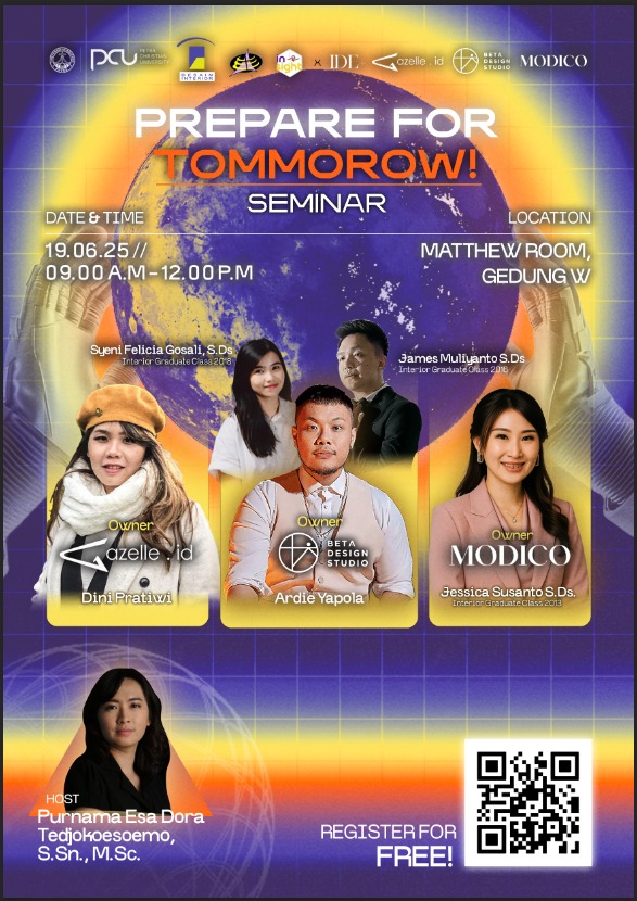 Pada tanggal 19 Juni 2025 jam 09.00 - 12.00 WIB bertempat Matthew Room gedung W, Program Studi Desain Komunikasi Visual mengadakan seminar dengan topik "Prepare for Tommorow". Dengan narasumber Syeni Felicia Gosali, S.Ds. dan James Muliyanto, S.Ds. dan Dini Pratiwi dan Ardie Yapola serta Jessica Sutanto, S.Ds. Sebagai moderator ialah Purnama Esa Dora T., M.Sc.