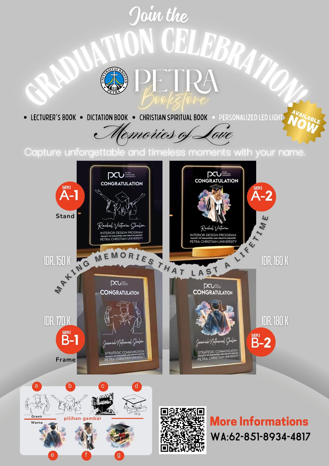 Dalam rangka memeriahkan Wisuda September 2025 Petra Bookstore menyediakan beberapa aksesoris yang berhubungan dengan wisuda UK Petra.