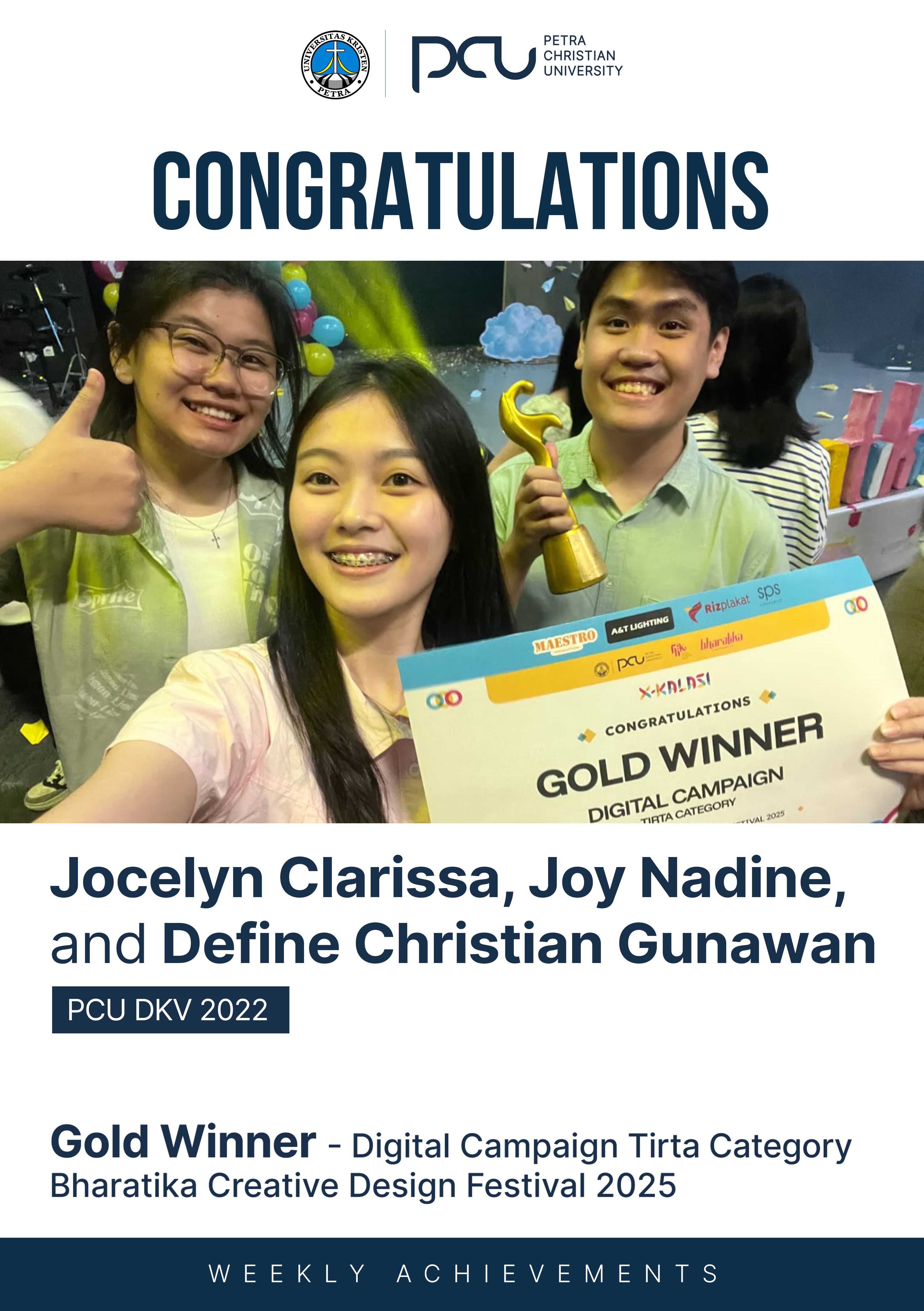 Selamat atas prestasi yang diraih oleh Jocelyn Clarissa, Joy Nadine, dan Define Christian Gunawan sebagai Gold Winner dalam Digital Campaign Tirta Category Bharatika Creative Design Festival 2025