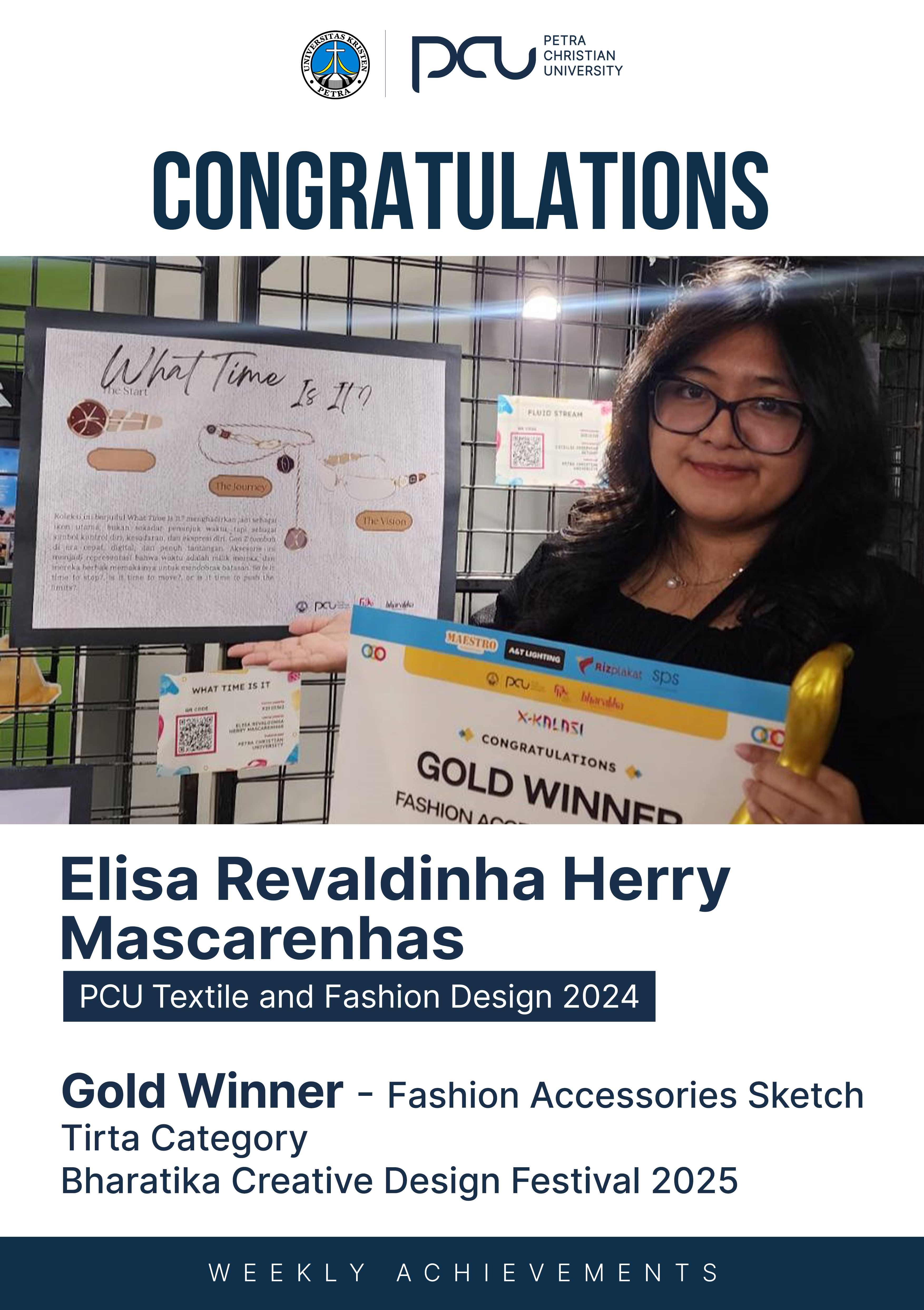 Selamat atas prestasi yang diraih oleh Elisa Revaldinha Herry Mascarenhas sebagai Gold Winner dalam Fashion Accessories Sketch Tirta Category Bharatika Creative Design Festival 2025