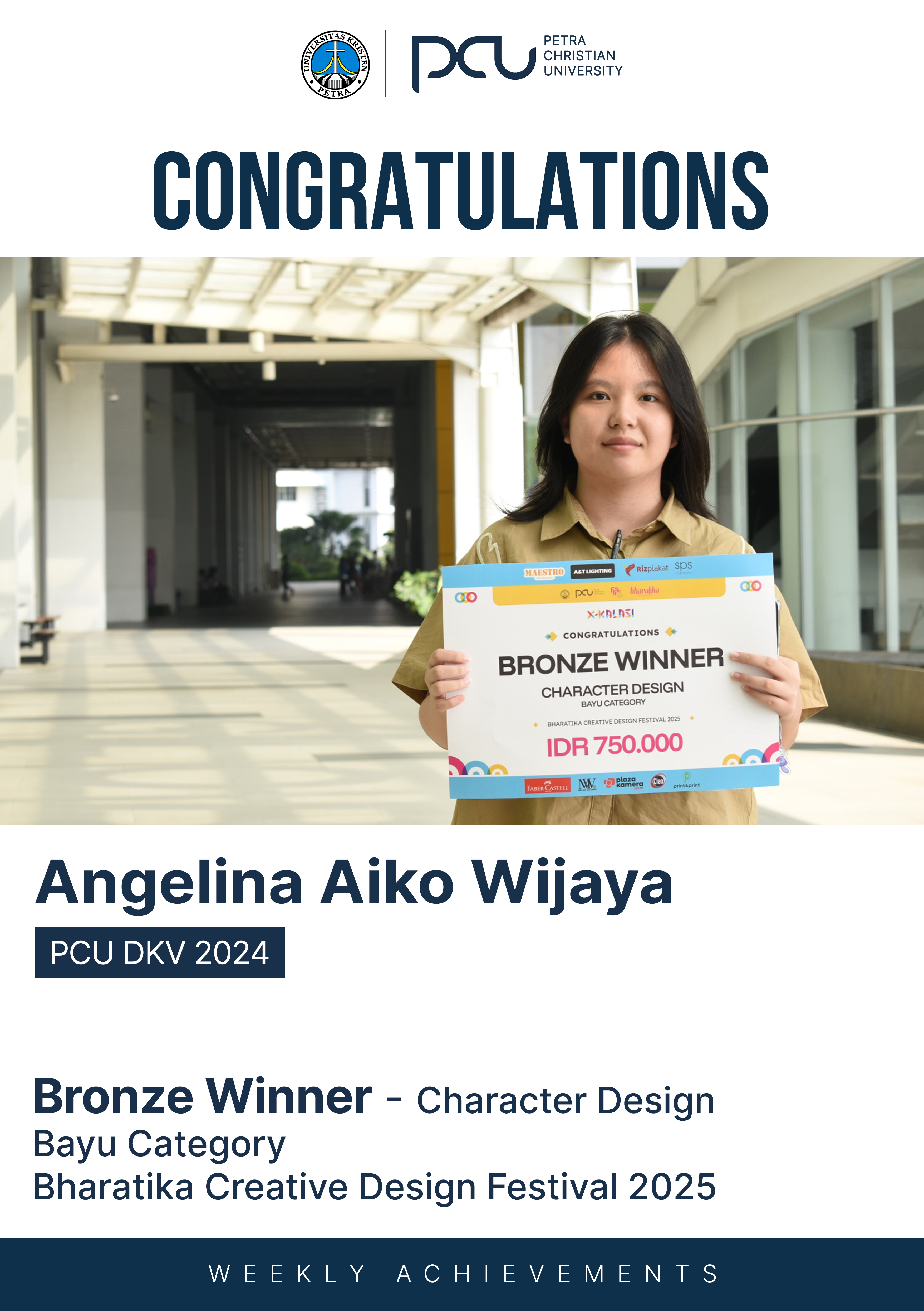 Selamat atas prestasi yang diraih oleh Angelina Aiko Wijaya sebagai Gold Winner dalam Character Design Bayu Category Bharatika Creative Design Festival 2025