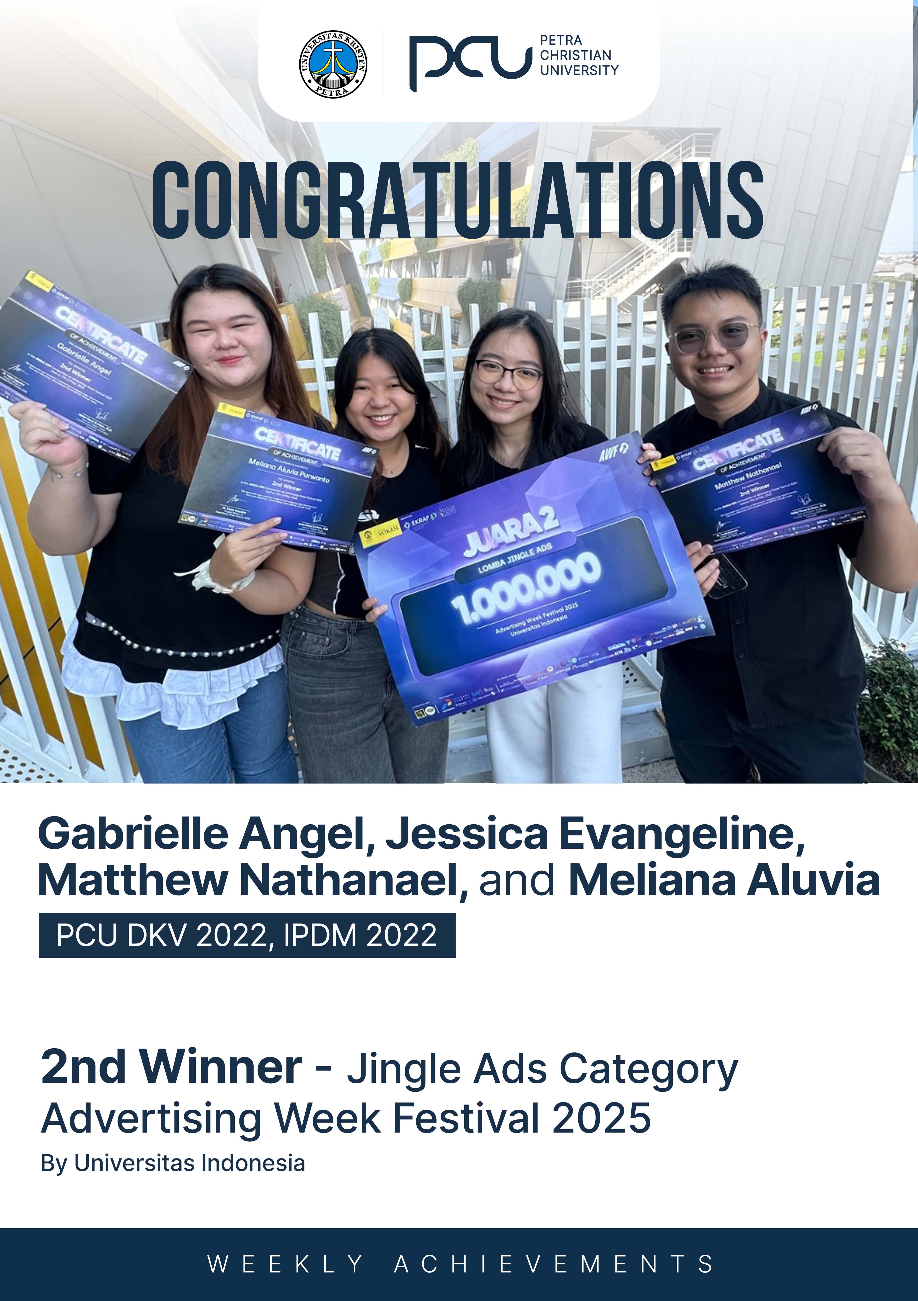 Selamat atas prestasi yang diraih oleh Gabrielle Angel, Jessica Evangeline, Matthew Nathanael dan Meliana Aluvia sebagai 2nd Winner dalam Jingle Ads Category Advertising Week Festival 2025 by Universitas Indonesia