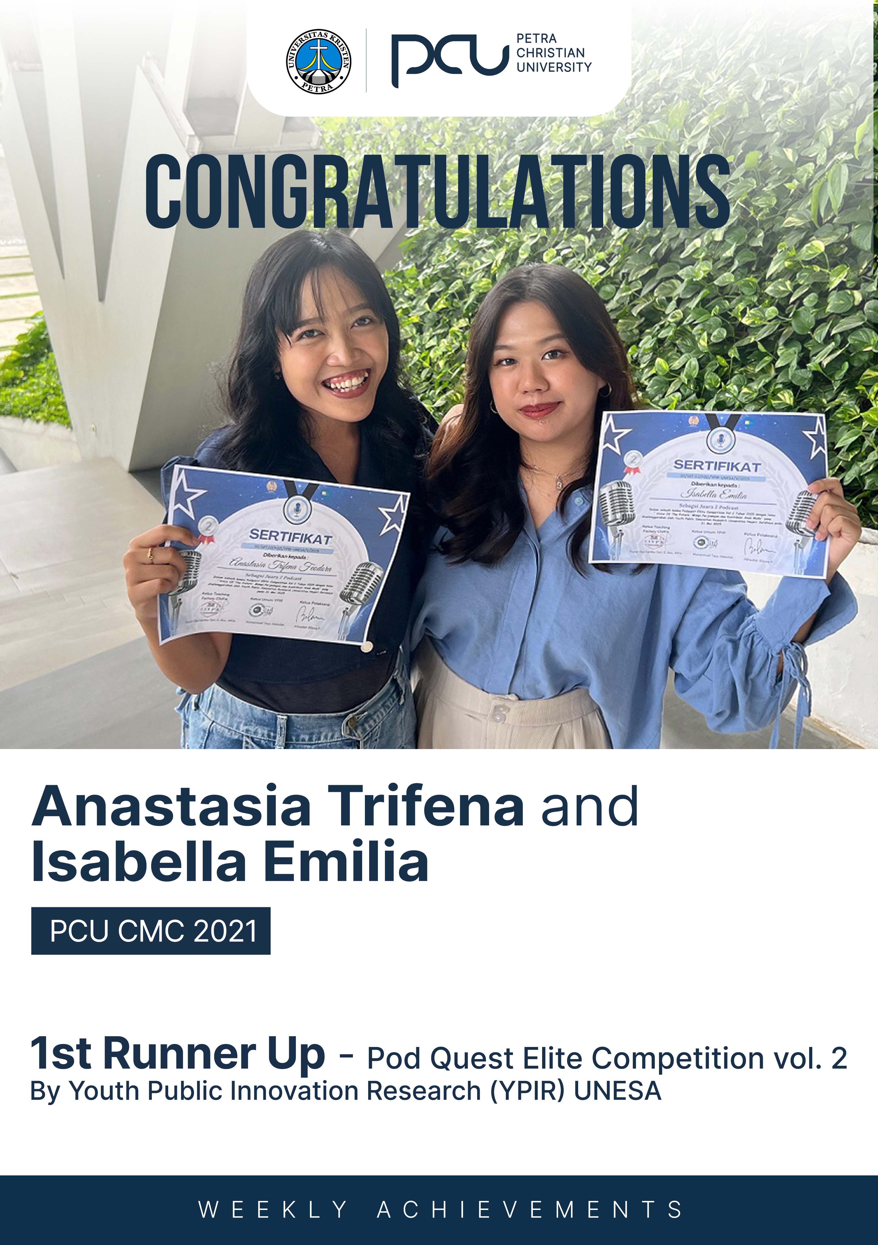 Selamat atas prestasi yang diraih oleh Anastasia Trifena dan Isabella Emilia sebagai 1st Runner Up dalam Pod Quest Elite Competition Vol.2 by Youth Public Research (YPIR) Unesa