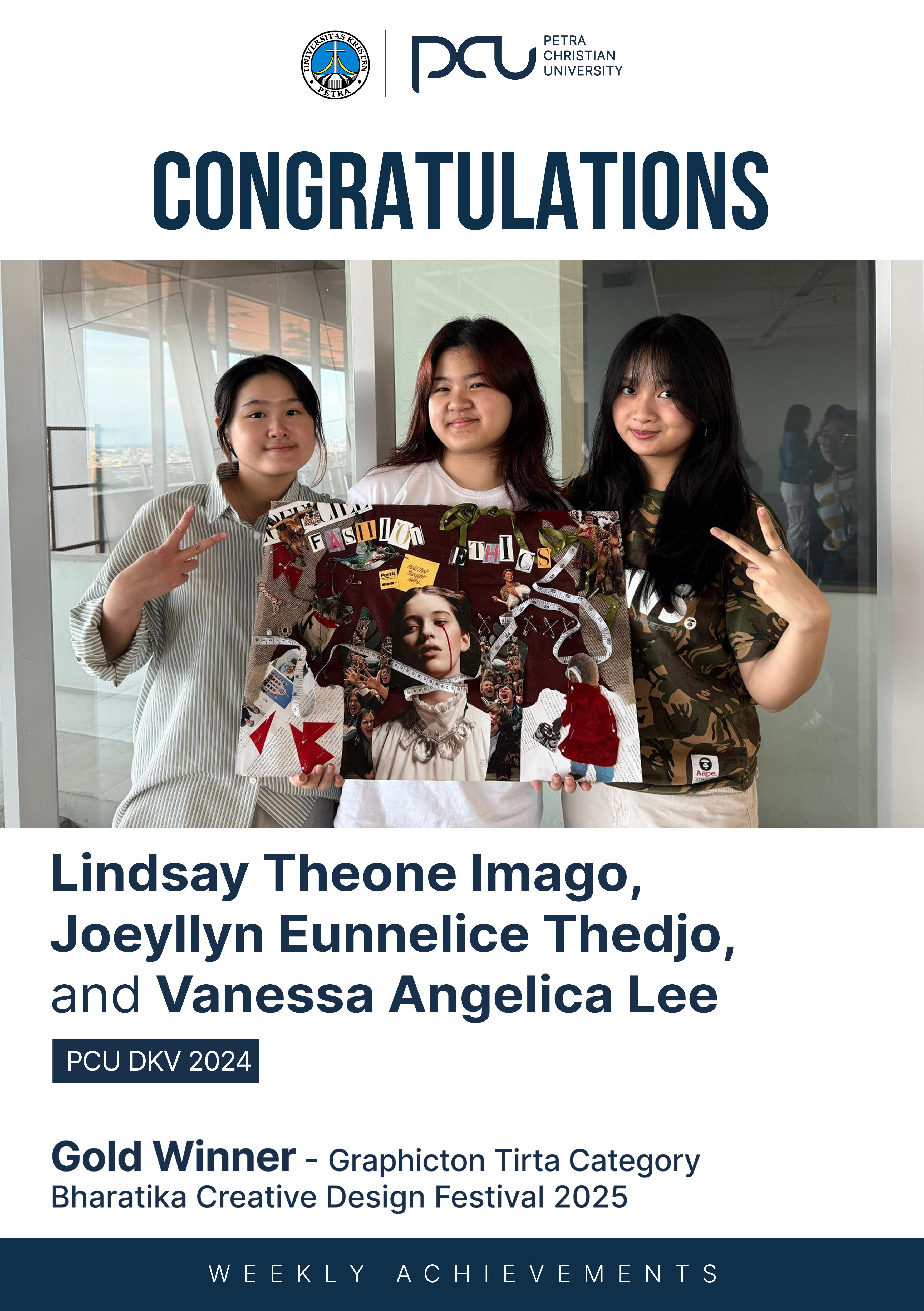 Selamat atas prestasi yang diraih oleh Lindsay Theone Imago, Joeyllyn Eunnelice Thedjo, Vanessa Angelica Lee sebagai Gold Winner dalam Graphicton Tirta Category Bharatika Creative Design Festival 2025