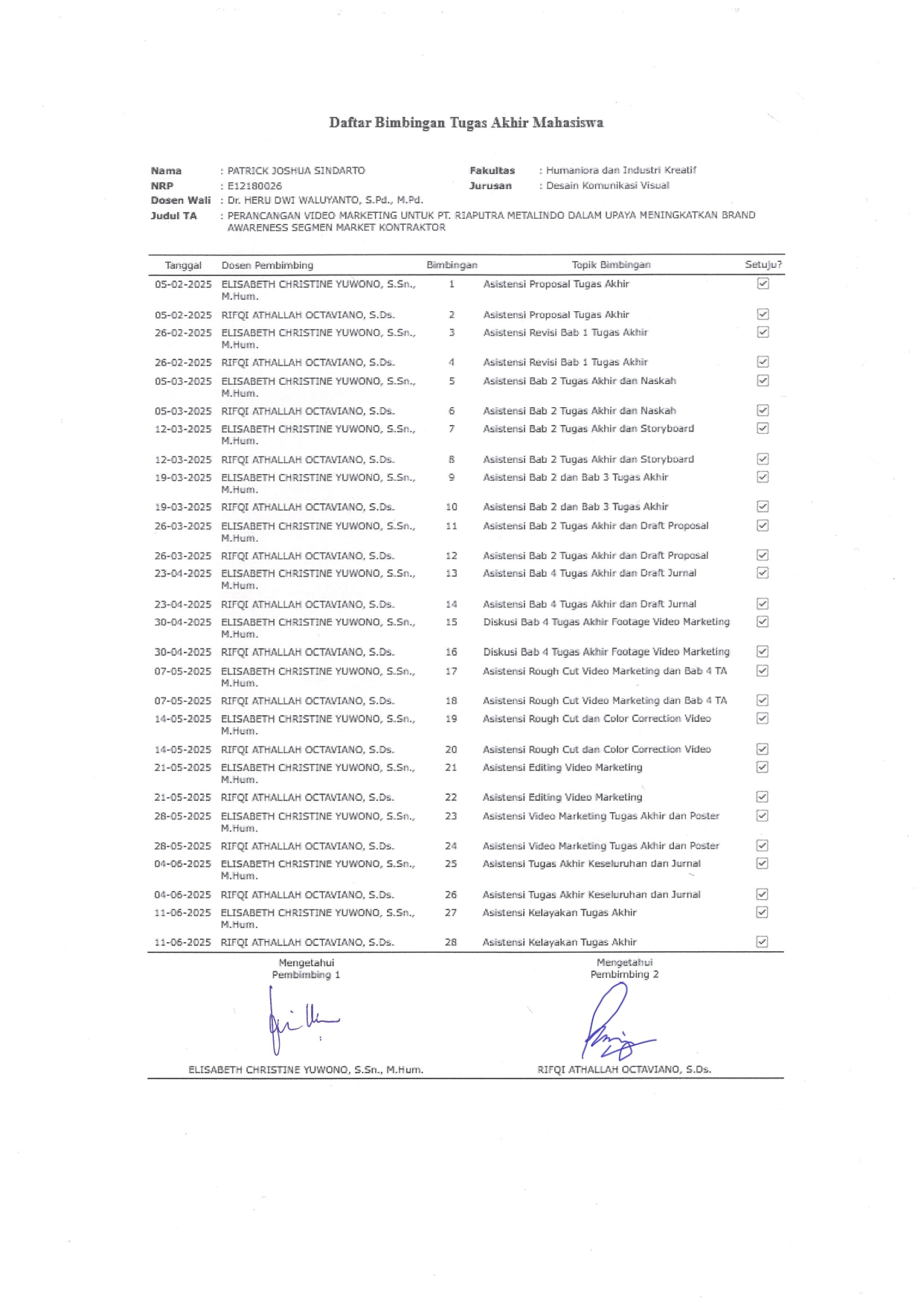 PT Riaputra Metalindo merupakan perusahaan besi dengan pengalaman lebih dari dua puluh lima tahun yang menghadapi tantangan dalam membangun brand awareness di segmen kontraktor. Ketergantungan pada sistem distribusi melalui toko atau distributor yang menggunakan metode pembayaran tempo membuat perusahaan sulit bersaing secara langsung di pasar. Penelitian ini bertujuan merancang video marketing berupa video branding guna meningkatkan brand awareness di kalangan kontraktor. Metode yang digunakan adalah deskriptif kualitatif melalui wawancara dengan Kepala Branding PT Riaputra Metalindo dan studi literatur. Proses perancangan dilakukan melalui tahap pra-produksi, produksi, dan pasca-produksi. Hasil akhirnya berupa video berdurasi satu menit empat puluh lima detik yang menampilkan permasalahan umum kontraktor serta solusi yang ditawarkan oleh perusahaan. Video dipublikasikan melalui akun resmi PT. Riaputra Metalindo di Facebook Ads, Instagram Ads, dan kanal YouTube. Hasil menunjukkan bahwa video branding mampu menarik perhatian audiens, menyampaikan pesan perusahaan secara kuat, dan meningkatkan interaksi. Kesimpulan menyatakan bahwa video branding merupakan media yang efektif dalam membangun citra profesional dan meningkatkan brand awareness di kalangan kontraktor.