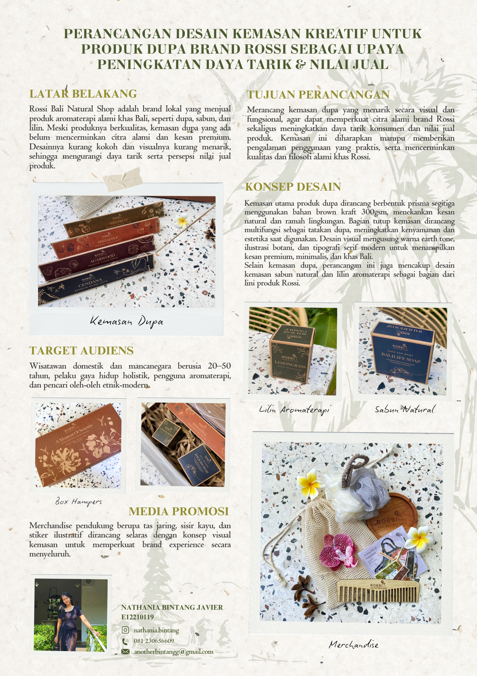 Kemasan memegang peran penting dalam membentuk persepsi konsumen serta mendukung strategi pemasaran produk. Penelitian ini membahas perancangan ulang kemasan dupa merek Rossi asal Bali, dengan fokus pada bagaimana menciptakan kemasan yang kokoh dan memiliki desain visual yang menarik untuk meningkatkan daya tarik dan nilai jual produk. Metode penelitian menggunakan pendekatan kualitatif yang mencakup observasi langsung, wawancara dengan pemilik usaha, serta studi literatur yang relevan. Hasil dari perancangan berupa kemasan berbentuk prisma segitiga yang dibuat dari bahan kertas kraft 350gsm, dilengkapi fitur tatakan dupa yang terintegrasi dalam struktur kemasan. Desain kemasan ini tidak hanya memberikan kesan estetis dan fungsional, tetapi juga menonjolkan kekokohan serta keunikan bentuk sebagai elemen pembeda di pasar. Diharapkan, rancangan ini mampu memperkuat identitas visual merek dan mendorong peningkatan nilai jual produk di tengah persaingan industri.