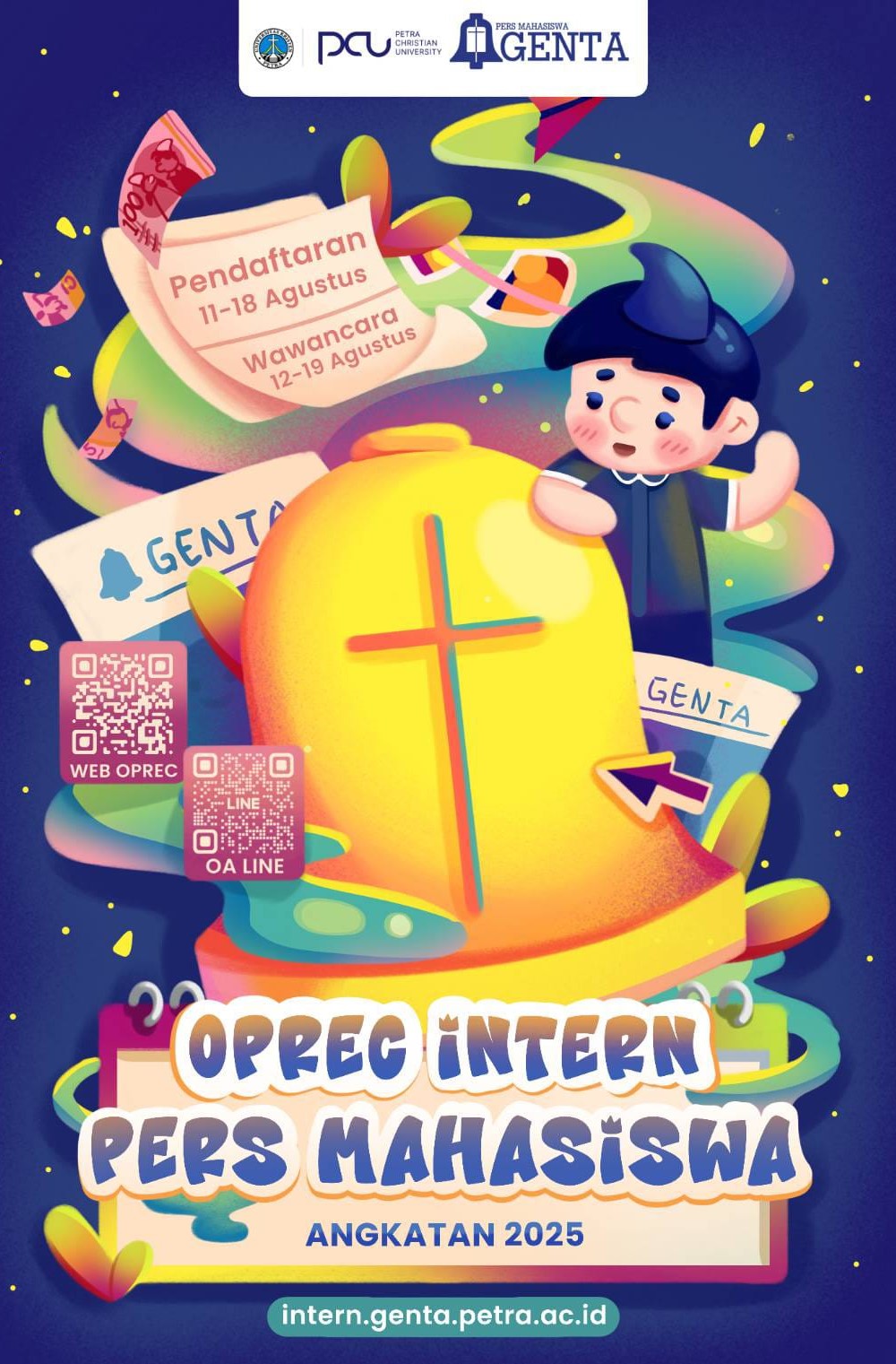 Open Recruitment Intern Pers Mahasiswa GENTA untuk mahasiswa angkatan 2025. Pendaftaran dibuka pada 11-18 Agustus 2025 dan wawancara pada 12-19 Agustus 2025.