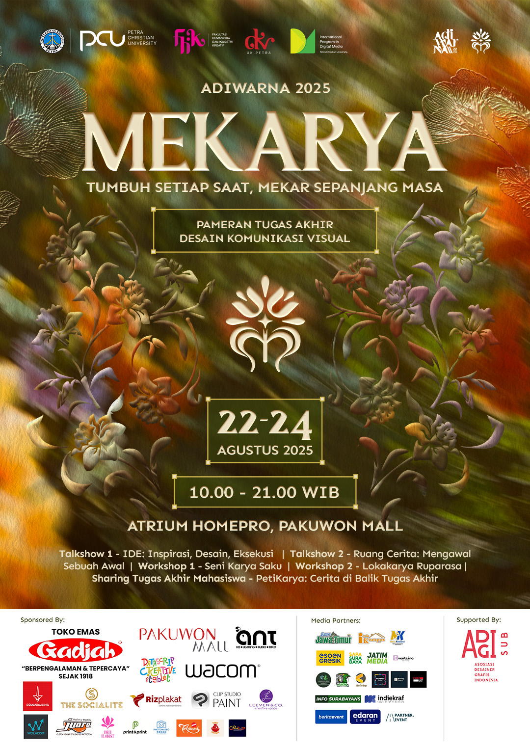 Adiwarna 2025 adalah acara tahunan yang memamerkan tugas akhir dari mahasiswa Desain Komunikasi Visual Universitas Kristen Petra. Melalui kegiatan ini kami ingin menjadi wadah yang memberikan pengetahuan serta pemahaman lebih mengenai luasnya dunia desain dan industrinya. Tema Adiwarna 2025 ini adalah Mekarya, yang merupakan gabungan dari kata "mekar" dan "karya" yang menggambarkan proses tumbuh dan berkembangnya sebuah karya dari benih kecil hingga menjadi sesuatu yang indah, bermakna, dan memberi dampak. Pameran tugas akhir dari Desain Komunikasi Visual ini diselenggarakan pada 22-24 Agustus 2025 bertempat Atrium Homepro Pakuwon Mall Surabaya.