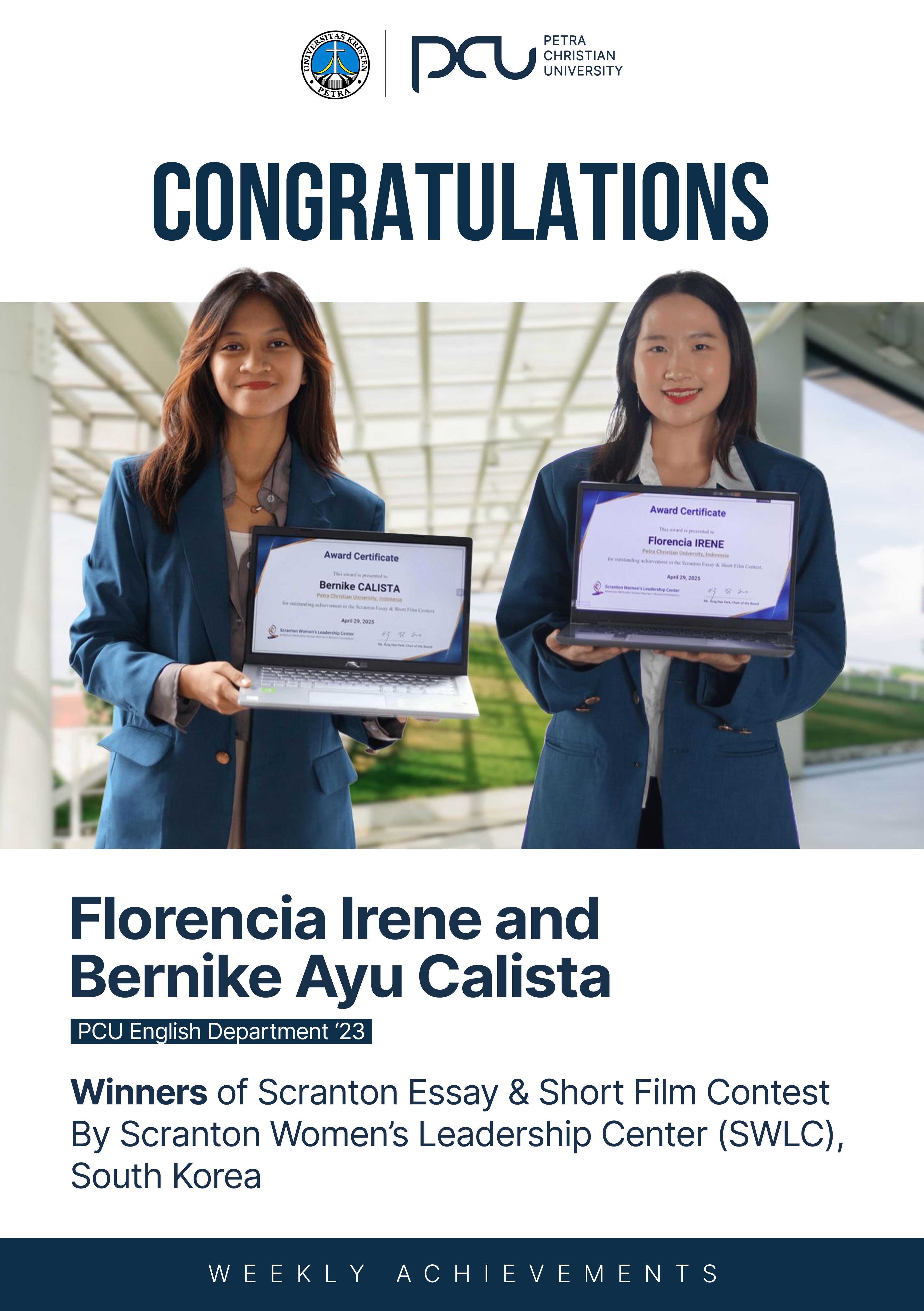 Selamat atas prestasi yang diraih oleh Florencia Irene dan Bernike Ayu Calista sebagai Winners of Scranton Essay & Short Film Contest by Scranton Women's Leadership Center (SWLC) South Korea