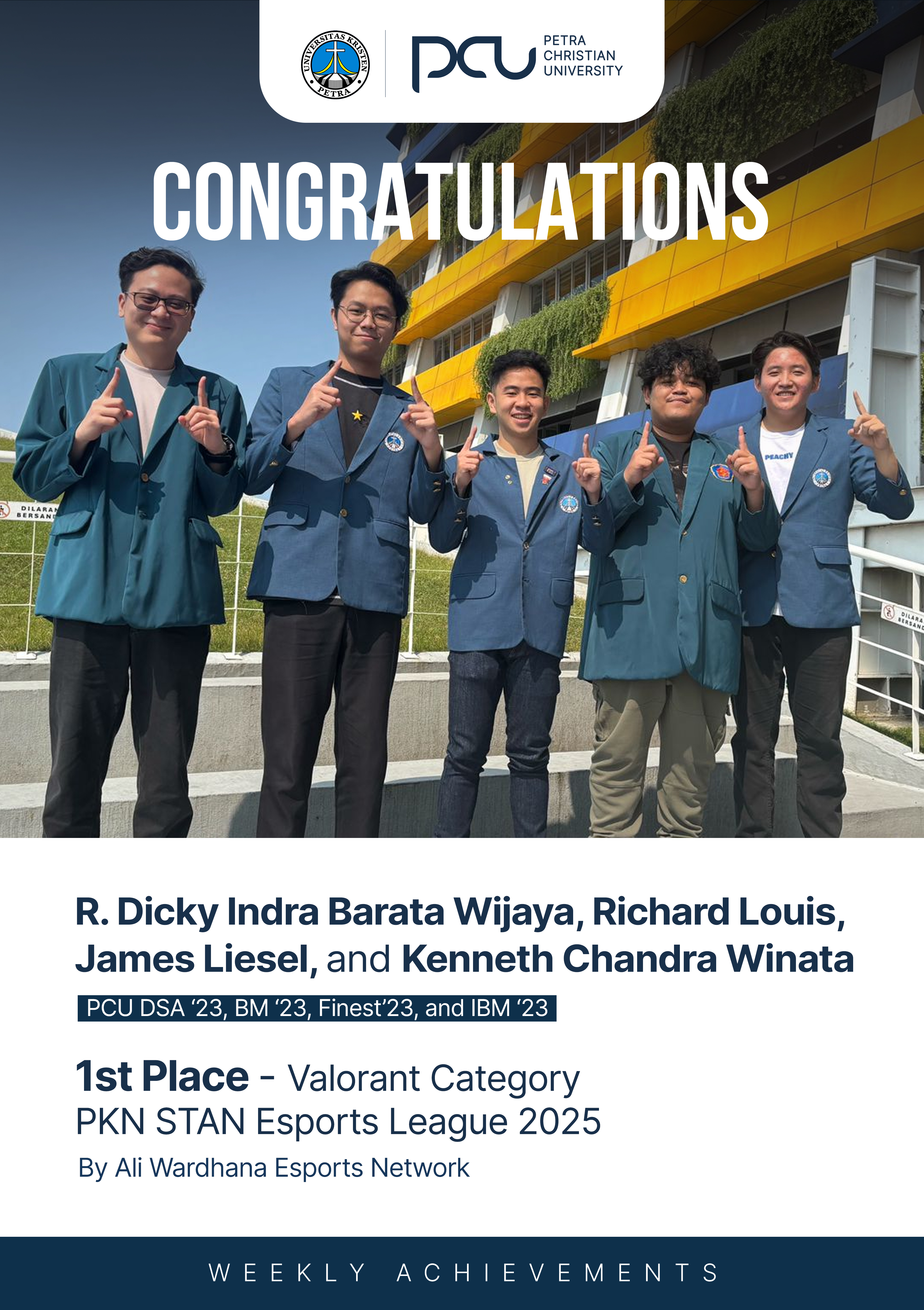 Selamat atas prestasi yang diraih oleh R. Dicky Indra Barata Wijaya, Richard Louis, James Liesel, Kenneth Chandra Winata sebagai 1st Place of Valorant Category PKN STAN Esports League 2025 by Ali Wardhana Esports Network
