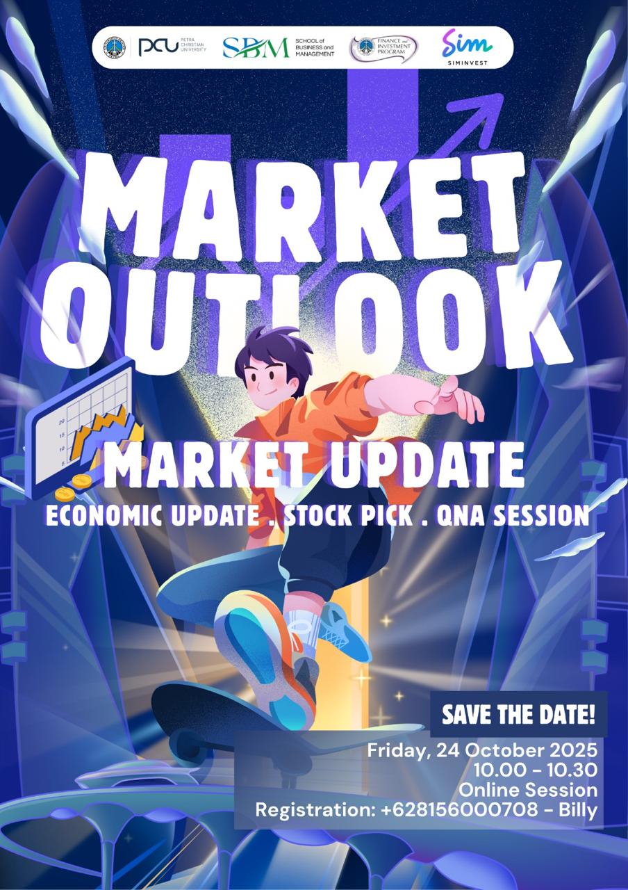 Acara Market Outlook: Market Update merupakan sesi literasi keuangan yang diselenggarakan oleh Galeri Investasi SimInvest Petra Christian University melalui School of Business and Management (SBM) dan Finance & Investment Program. Kegiatan ini bertujuan untuk memberikan wawasan terkini kepada mahasiswa mengenai kondisi pasar keuangan dan ekonomi global. Melalui topik Economic Update, Stock Pick, dan Q&A Session, peserta akan diajak memahami tren ekonomi yang sedang berlangsung, rekomendasi saham potensial, serta berdiskusi langsung dengan pembicara terkait strategi investasi yang relevan. Acara ini diadakan secara online pada Jumat, 24 Oktober 2025, pukul 10.00–10.30 WIB. Diharapkan melalui kegiatan ini, mahasiswa dapat meningkatkan literasi keuangan dan lebih siap dalam mengambil keputusan investasi yang cerdas dan rasional.