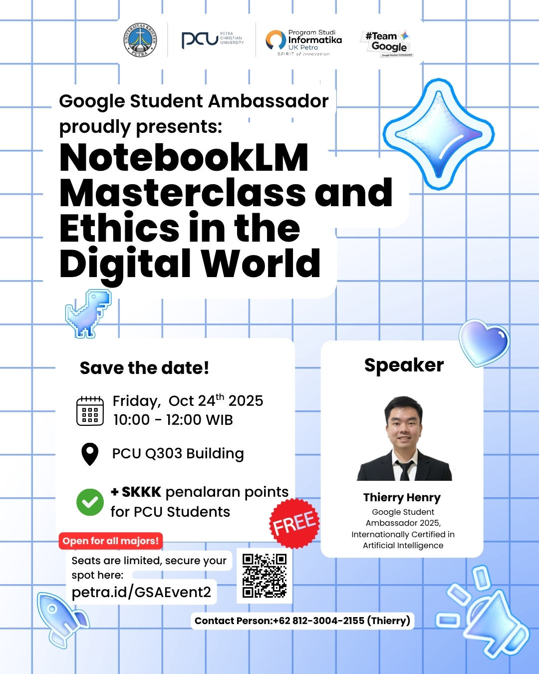 Program Studi Teknik Informatika Universitas Kristen Petra Surabaya, pada 24 Oktober 2025 jam 10.00 - 12.00 WIB mengadakan seminar dengan topik notebooklm masterclass and ethics in the digital world dengan narasumber Thierry Henry, Google Student Ambassadors 2025 AI Enthusiasts. Acara ini diselenggarakan ditempat Q.303