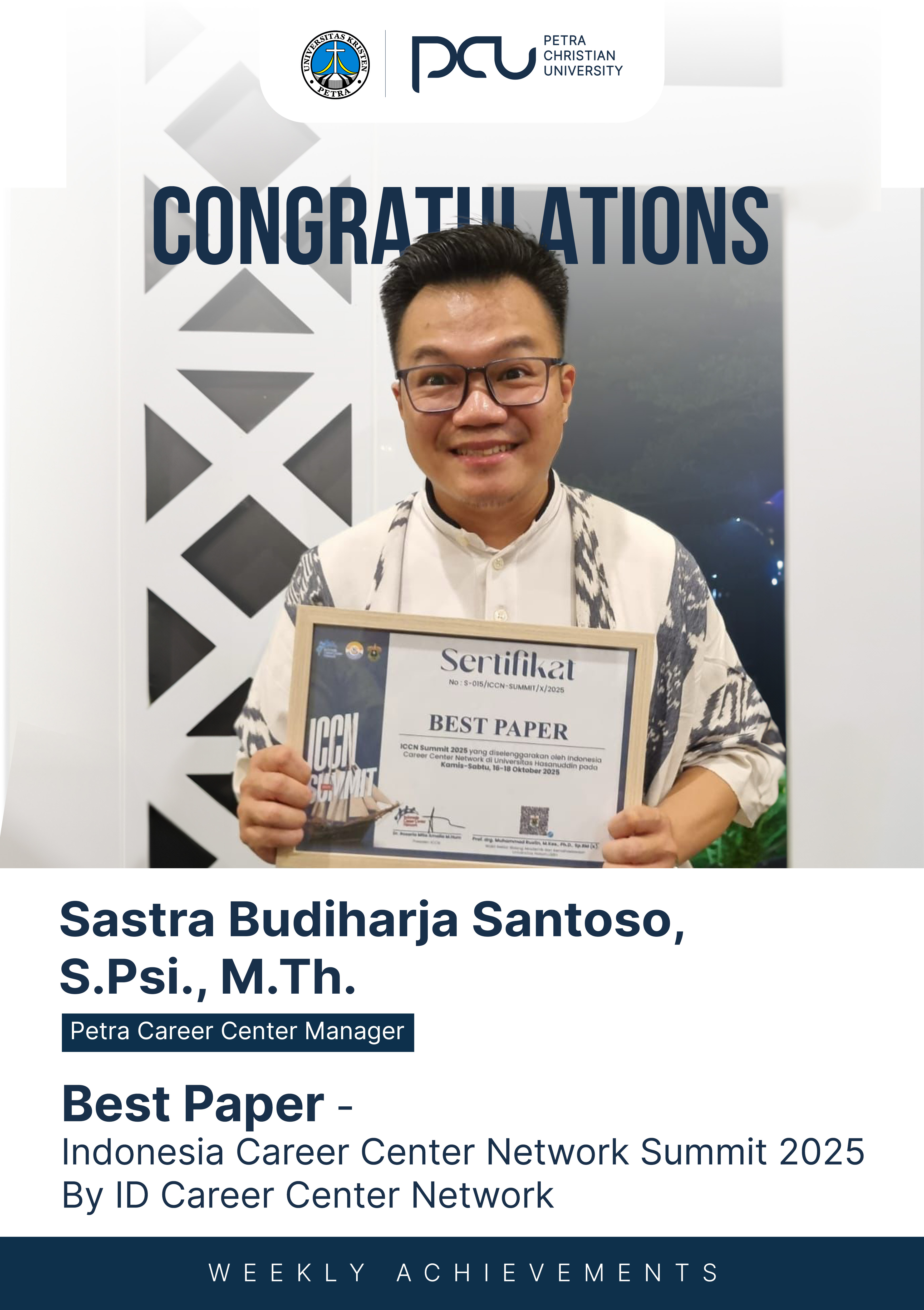 Selamat atas prestasi yang diraih Sastra Budiharja Santoso, S.Psi., M.Th. sebagai Best Paper dalam Indonesia Career Center Network Summit 2025 by ID Career Center Network.