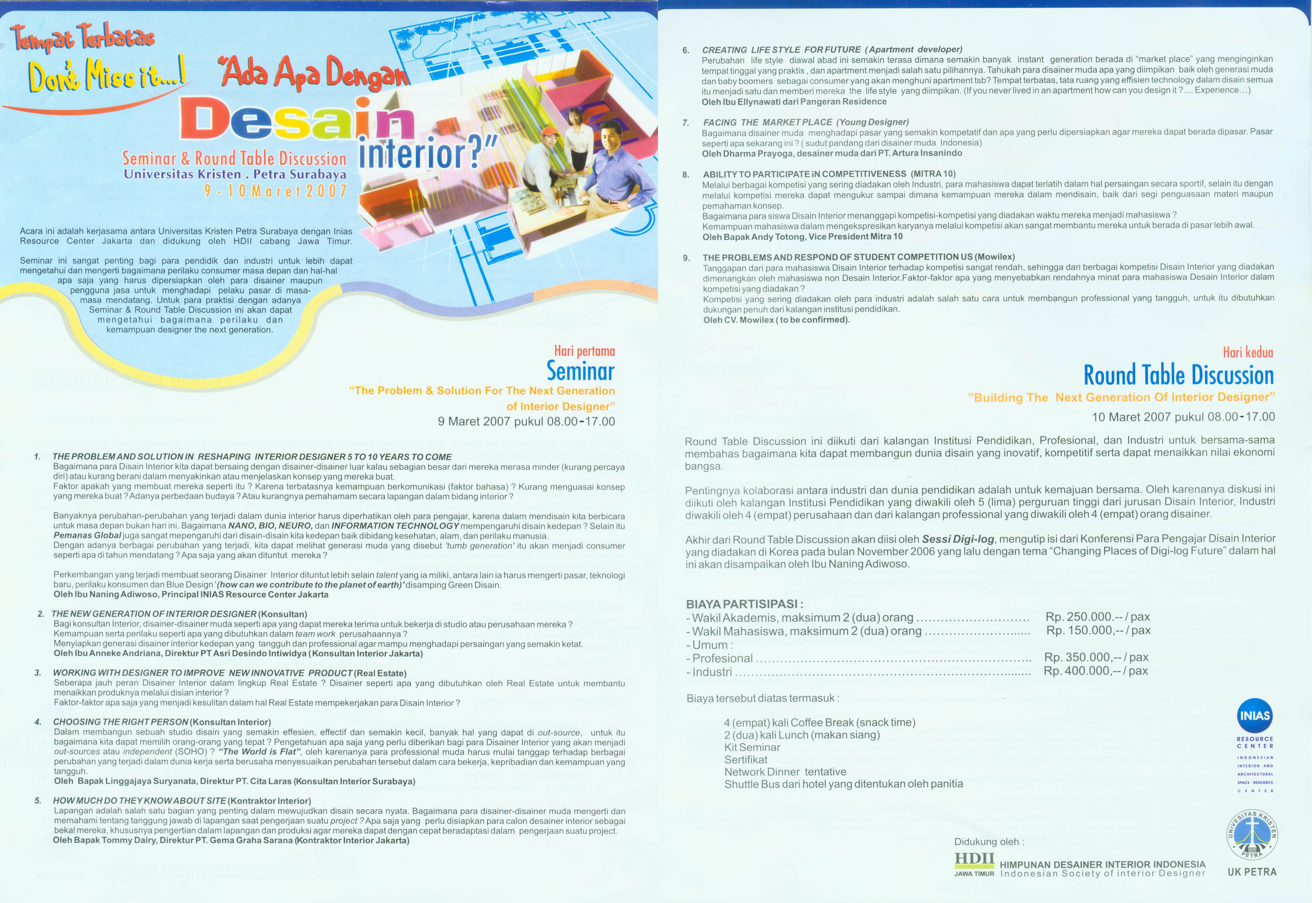 Acara ini adalah kerjasama Universitas Kristen Petra Surabaya dengan Inias Resource Center Jakarta dan didukung oleh HDII cabang Jawa Timur. Seminar dilaksanakan tanggal 9 Maret 2007 pukul 08.00 - 17.00 WIB, mengangkat tema "The Problem and Solution for The Next Generation of Interior Designer", sementara round table discussion mengangkat tema "Building The Next Generation of Interior Designer", tanggal 10 Maret 2007, pukul 08.00 - 17.00 WIB