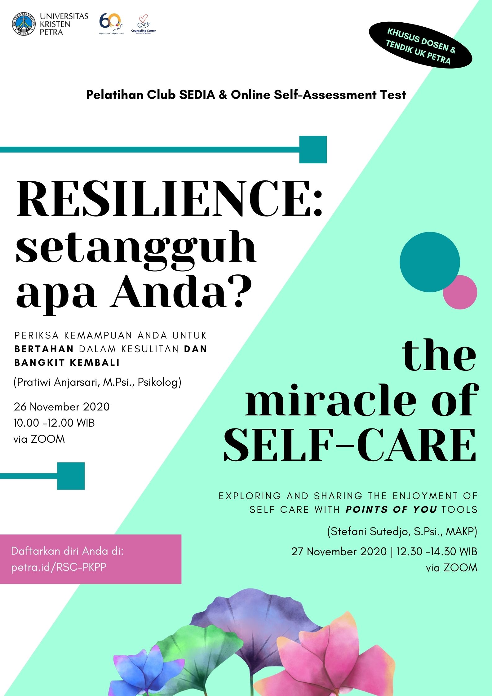 Pusat Konseling dan Pengembangan Pribadi UK Petra, mengadakan acara self assessment test & webinar club sedia. Webinar yang diadakan khusus untuk doses dan tendik UK Petra guna membekali peserta ketika menghadapi tekanan hidup dan kemampuan untuk bangkit kembali. Dengan narasumber Stefani Sutedjo, S.Psi., M.Akp (Psikologi) dan Pratiwi Anjarsari, S.Psi., M.Si (Psikologi), diadakan pada tanggal 26-27 November 2020 jam 12.30 - 14.30 WIB. via Zoom Meeting.