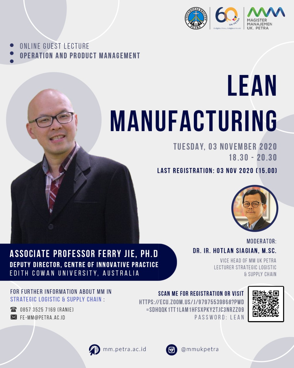 Program Studi Magister Manajemen pada 03 November 2020 jam 18.30 - 20.30 WIB mengadakan kuliah tamu dengan tema Lean Manufacturing dengan narasumber Ferry Jie, Ph.D dengan moderator Dr. Ir. Hotlan Siagian, M.Sc. Acara ini diselenggarakan secara online dengan aplikasi Zoom Meeting.