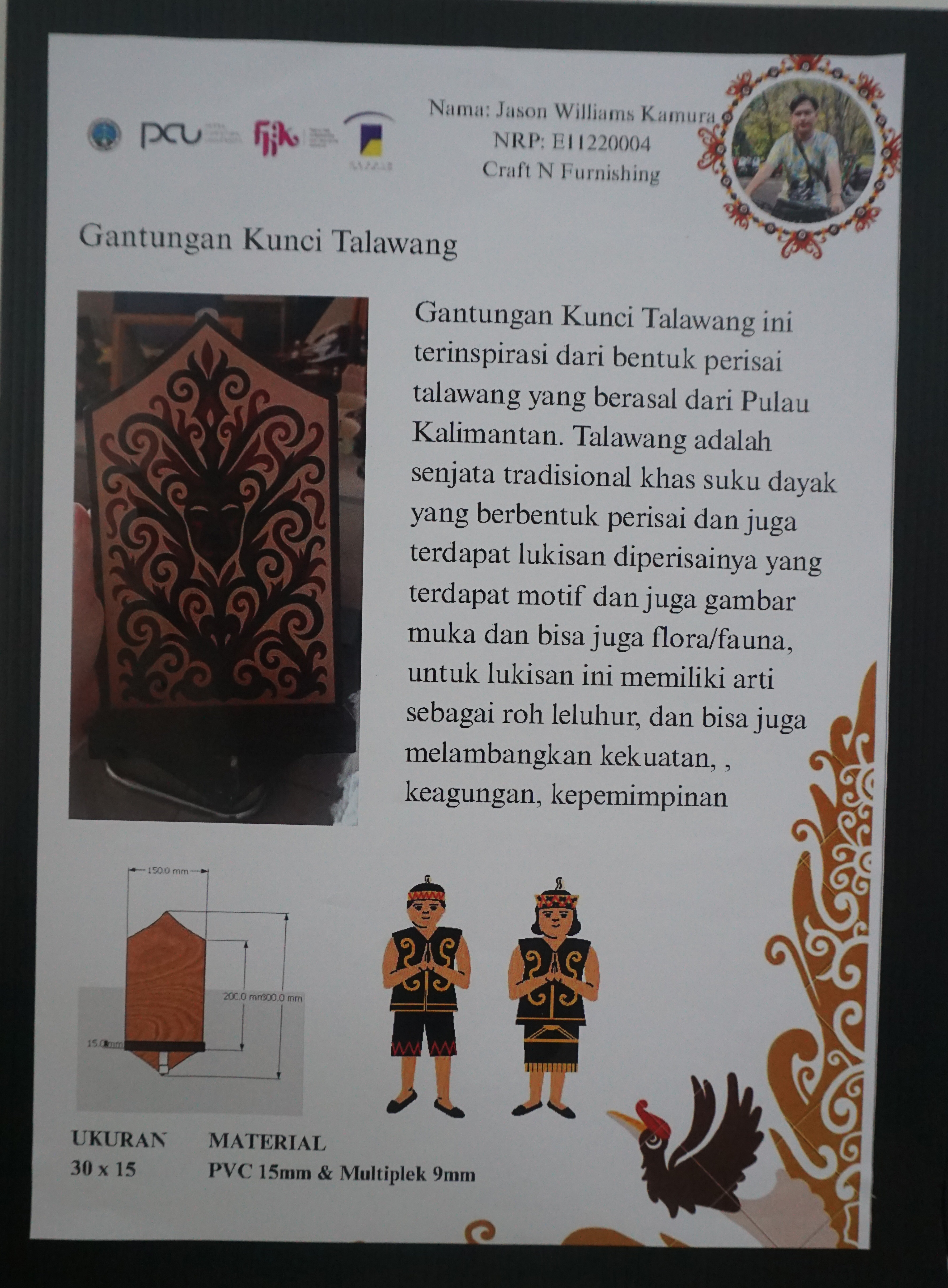 Dalam rangka menyemarakkan 27 tahun Prodi Desain Interior diselenggarakan seminar Insight bersama alumni dan pengguna lulusan, serta rangkaian acara IDE+ (Interior Design Exhibition and Workshop) 18-20 Juni 2025 yang menyajikan berbagai karya mata kuliah Personal Space, Presentasi Visual, Interior Design for Workspace, Furniture Design for Workspace, Interior Design for Cultural Space, Interior Product Design For Cultural Space, Craft and Furnishing, dan LEAP Final Project. Dalam pameran IDE+ tahun ini disajikan pula hasil karya kolaborasi project based learning Prodi Desain Interior PCU - UCSI dan UiTM. Salah satu materi pameran ini ialah Gantungan kunci Talawang. Karya dari Jason Williams Kamura (E11220004).