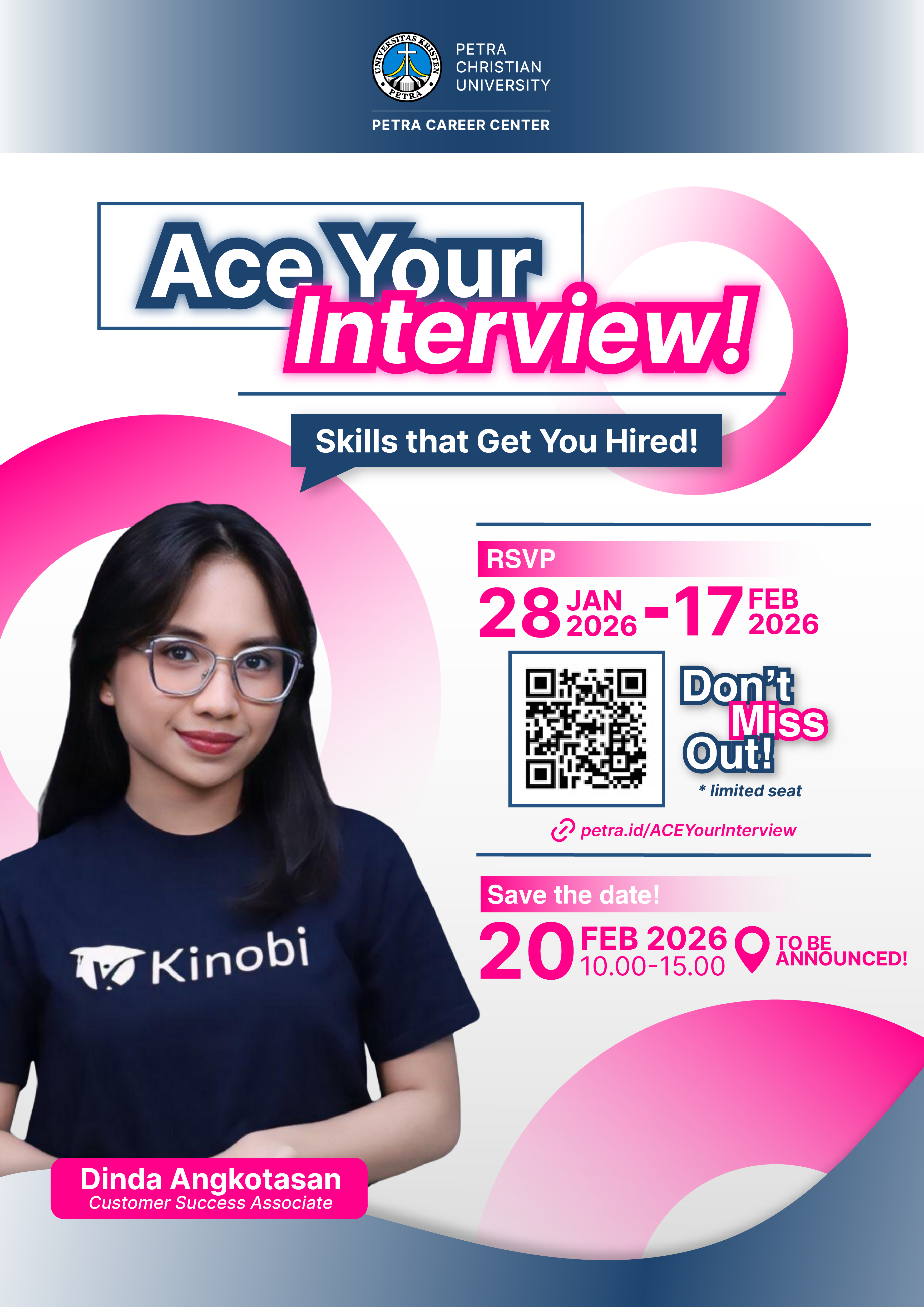 20 Februari 2026 jam 10.00 - 15.00 WIB Pusat Karir Universitas Kristen Petra mengadakan acara Career Heads Up: Ace Your Interview. Dengan narasumber Dinda Angkotasan. Career Heads Up: Ace Your Interview sebagai upaya untuk membekali peserta dengan kemampuan mengenali diri dan pengalaman, memahami perspektif HR dalam menilai kandidat, serta mengomunikasikan pengalaman secara terstruktur, relevan, dan bernilai. Melalui kombinasi pemaparan materi, aktivitas reflektif, dan simulasi interview, workshop ini diharapkan dapat meningkatkan kesiapan peserta dalam menghadapi proses interview kerja secara lebih percaya diri dan profesional.