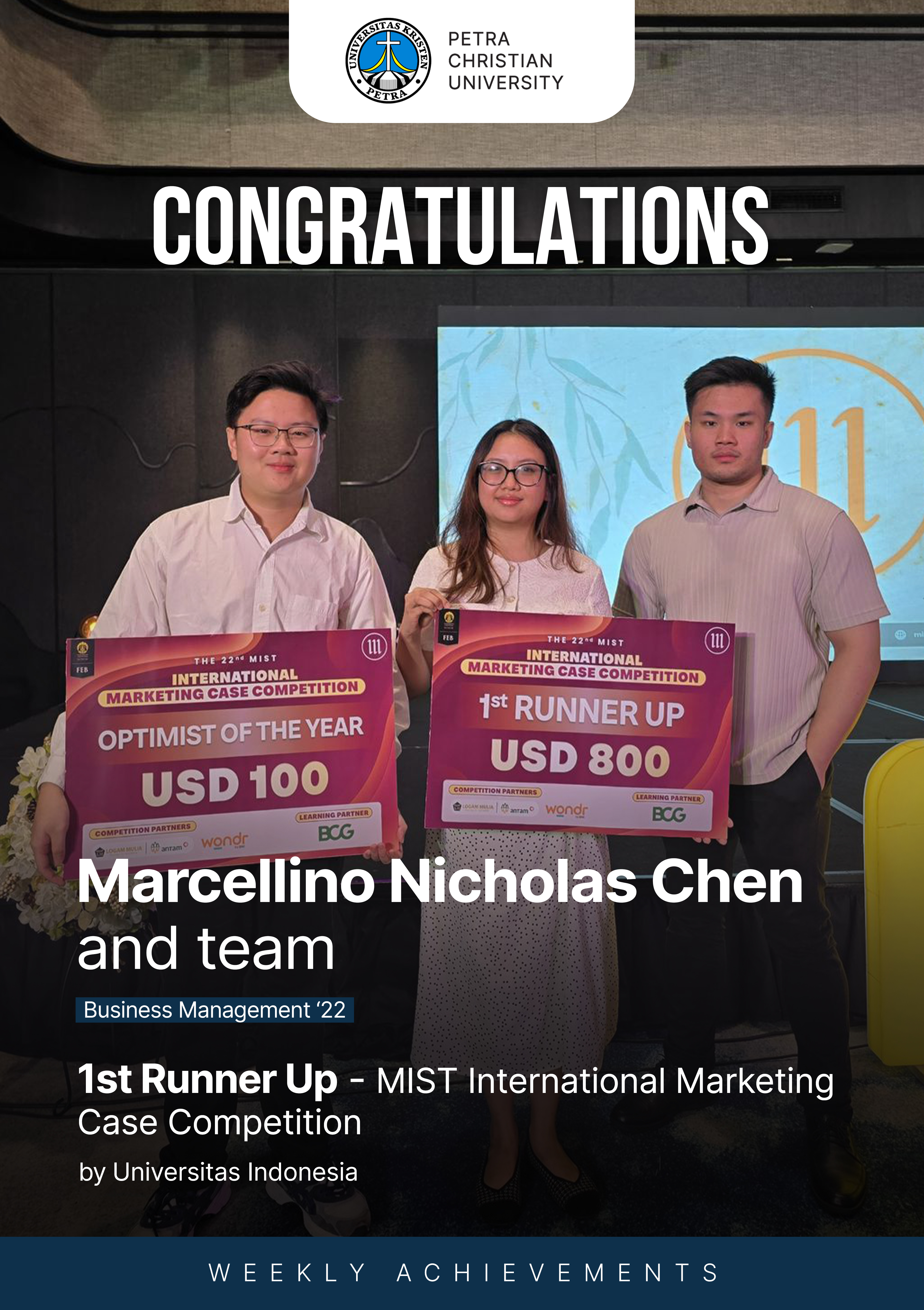 Selamat atas prestasi yang diraih Marcellino Nicholas Chen dan team sebagai 1st Runner Up dalam MIST International Marketing Case Competition by Universitas Indonesia