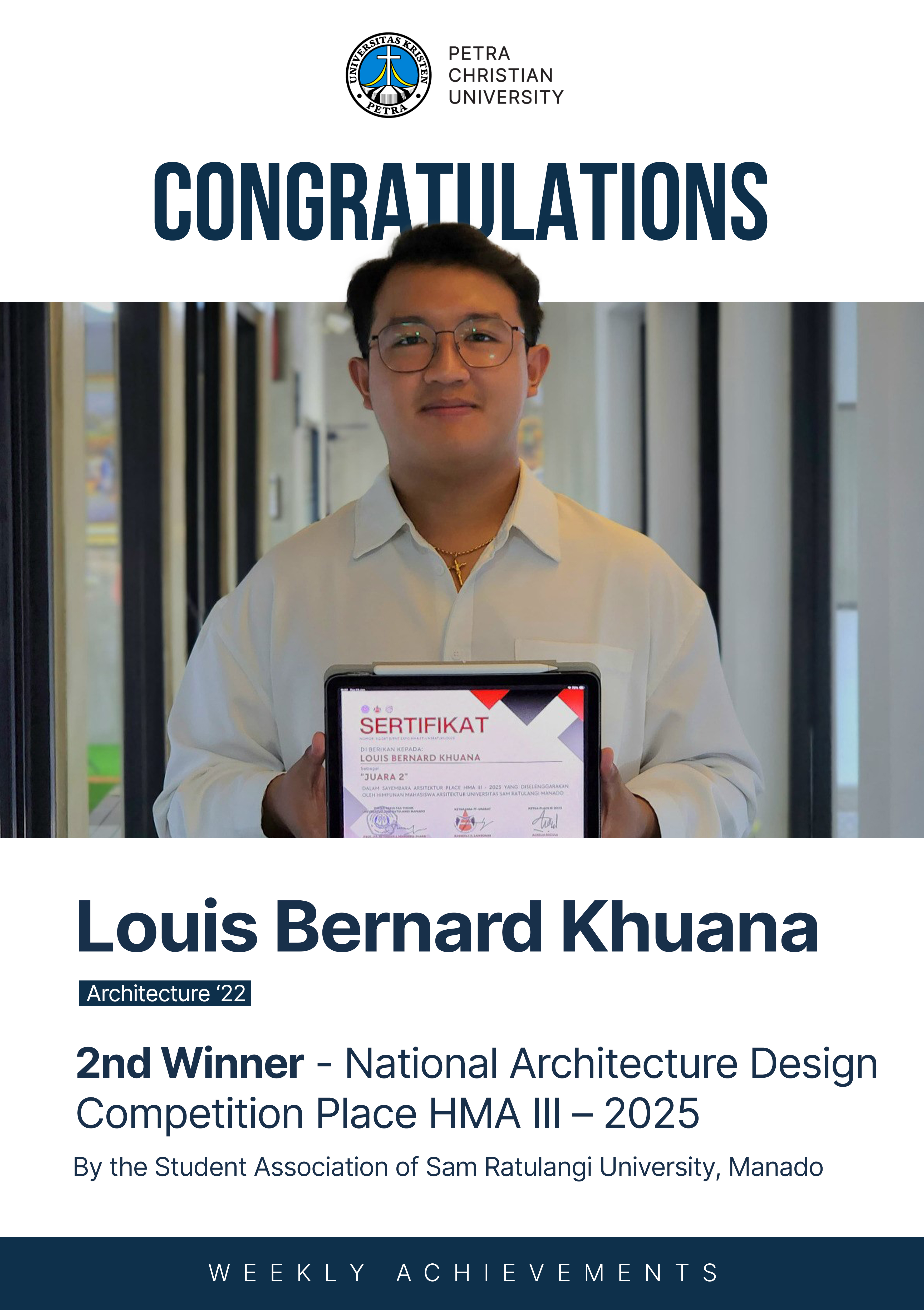 Selamat atas prestasi yang diraih Louis Bernard Khuana sebagai 2nd Winner dalam National Architecture Design Competition Place HMA III - 2025 by The Student Association of Sam Ratulangi University, Manado