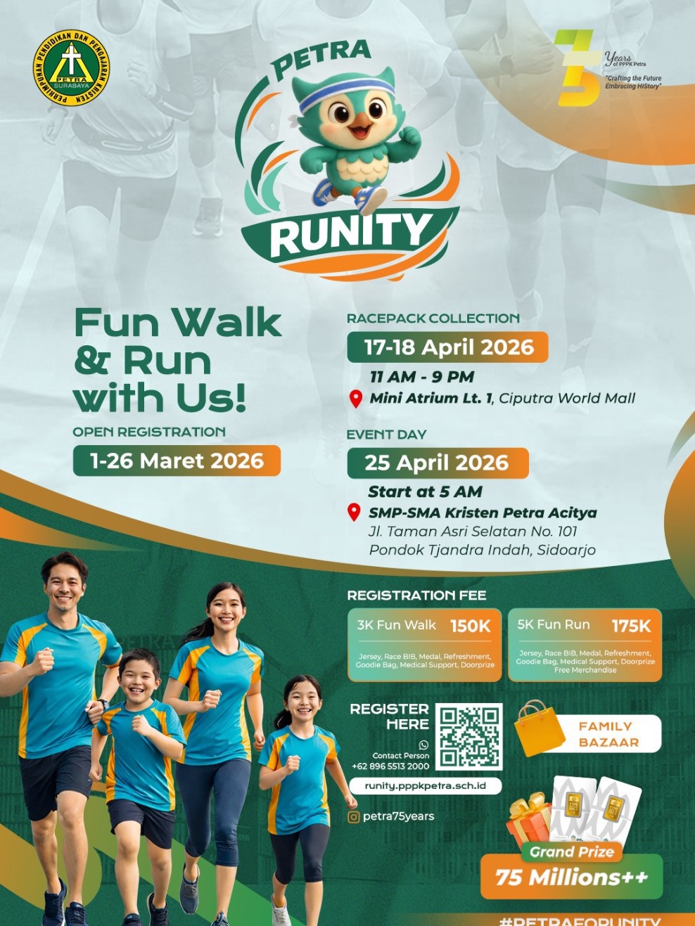 PPPK Petra menyelenggarakan kegiatan Jalan sehat dan lomba lari dengan tema Runity. Kegiatan ini diselenggarakan pada 25 April 2026 bertempat SMP-SMA Kristen Petra Acitya jalan Taman Asri Selatan No. 101 Pondok Tjandra Indah, Sidoarjo.