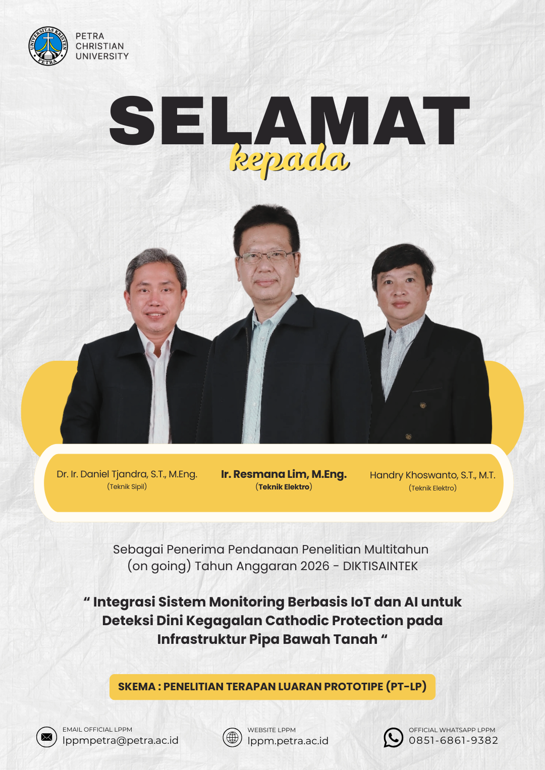 Ucapan selamat atas prestasi yang diraih oleh Dr. Ir. Daniel Tjandra, S.T., M.Eng., Ir. Resmana Lim, M.Eng., Handry Khoswanto, S.T., M.T. sebagai penerima pendanaan penelitian multitahun (on going) tahun anggaran 2026 - DIKTISAINTEK
