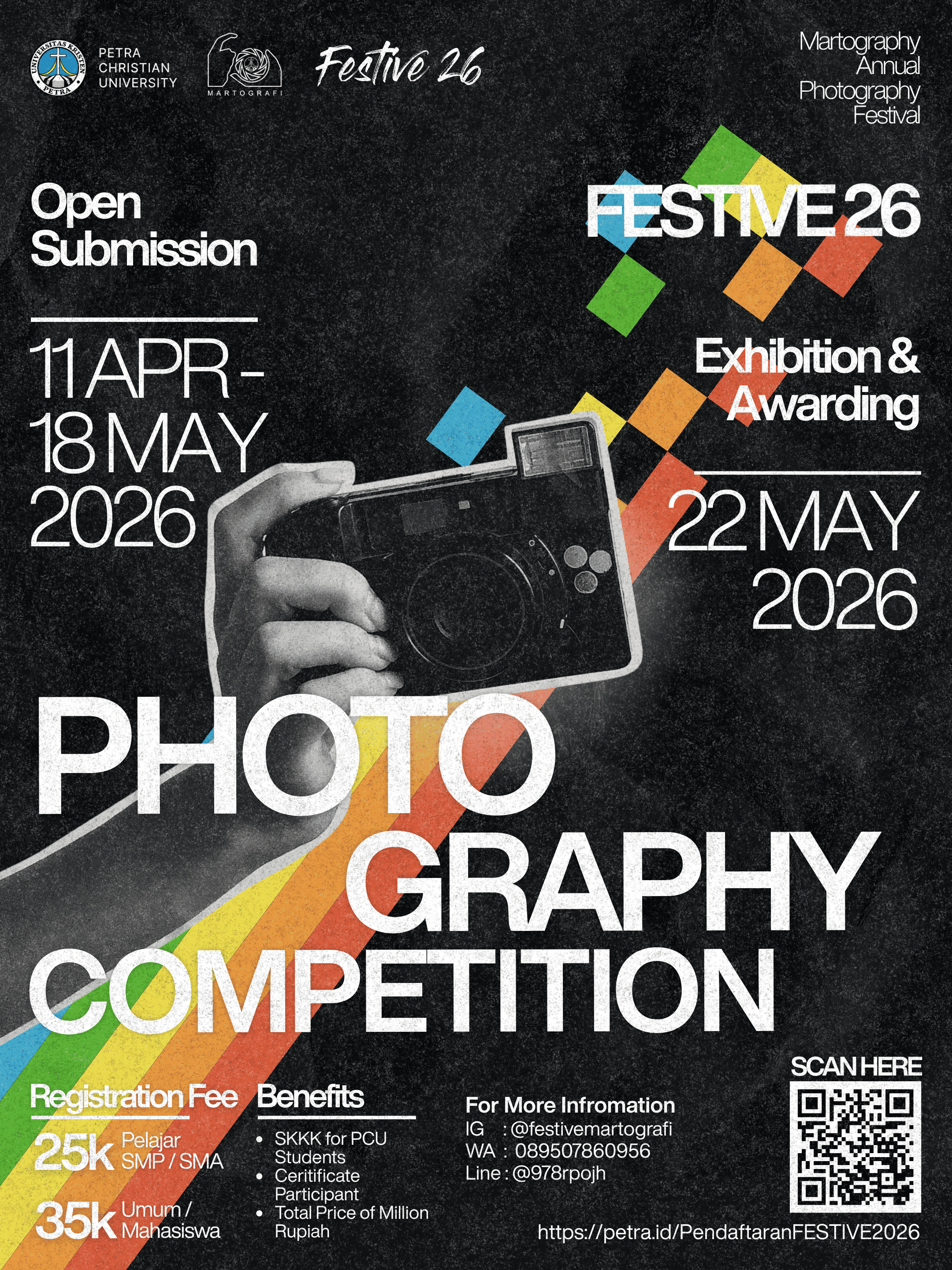 Festive Martografi 2026 merupakan kegiatan setiap tahunnya yang diadakan oleh UKM Martografi Universitas Kristen Petra. Rangkaian acara ini adalah Photography Competition, Photography Seminar dan Photography Exhibition. Pendaftaran lomba dibuka pada tanggal 11 April - 18 May 2026, dan pameran dan pemberian award pada 22 Mei 2026.