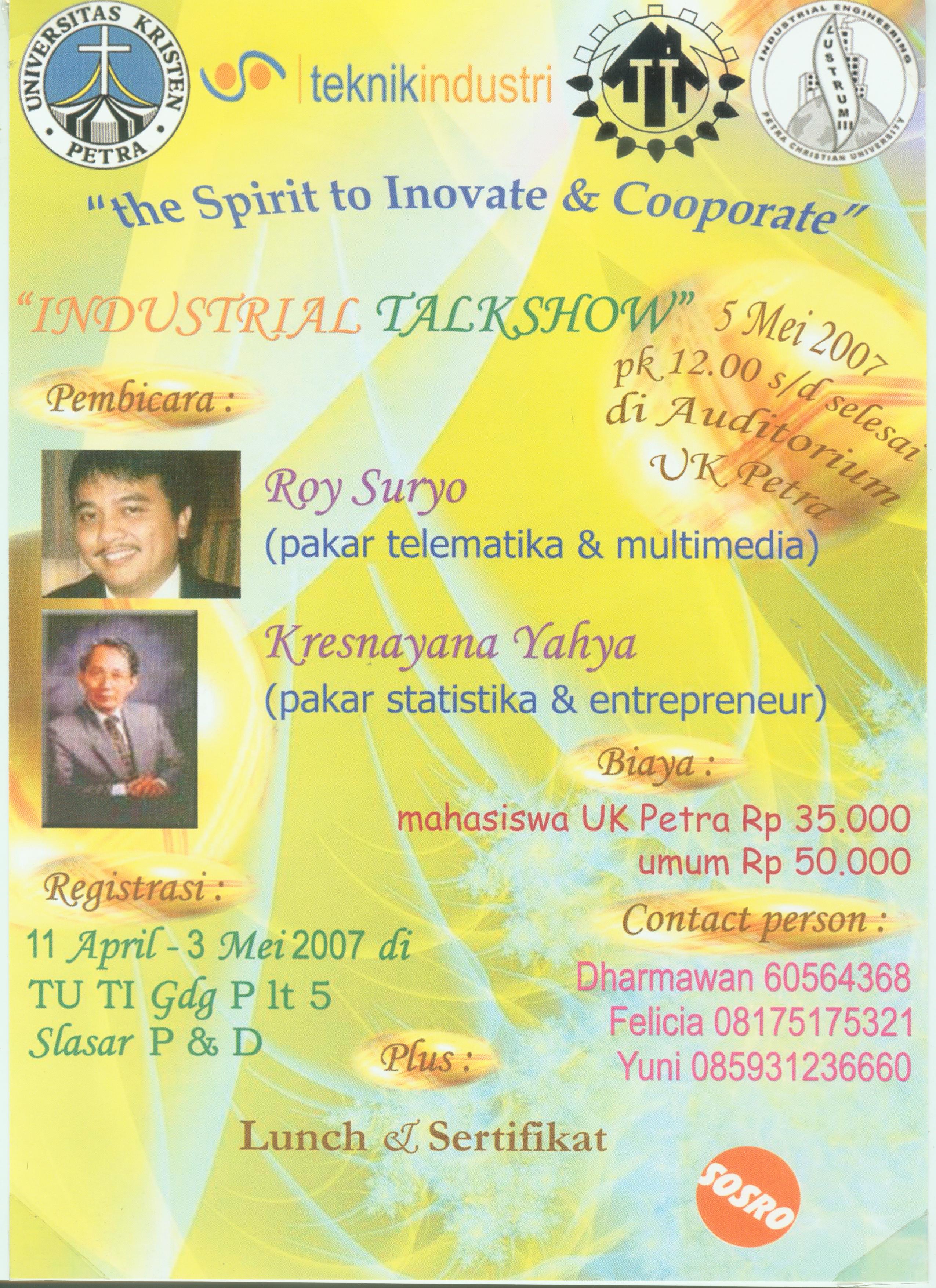 Acara yang diselenggarakan dalam rangka menyambut Lustrum III Jurusan Teknik Industri ini menghadirkan Roy Suryo dan Krenayana Yahya sebagai pembicara. Acara ini diadakan pada 5 Mei 2007 di Auditorium UK Petra.