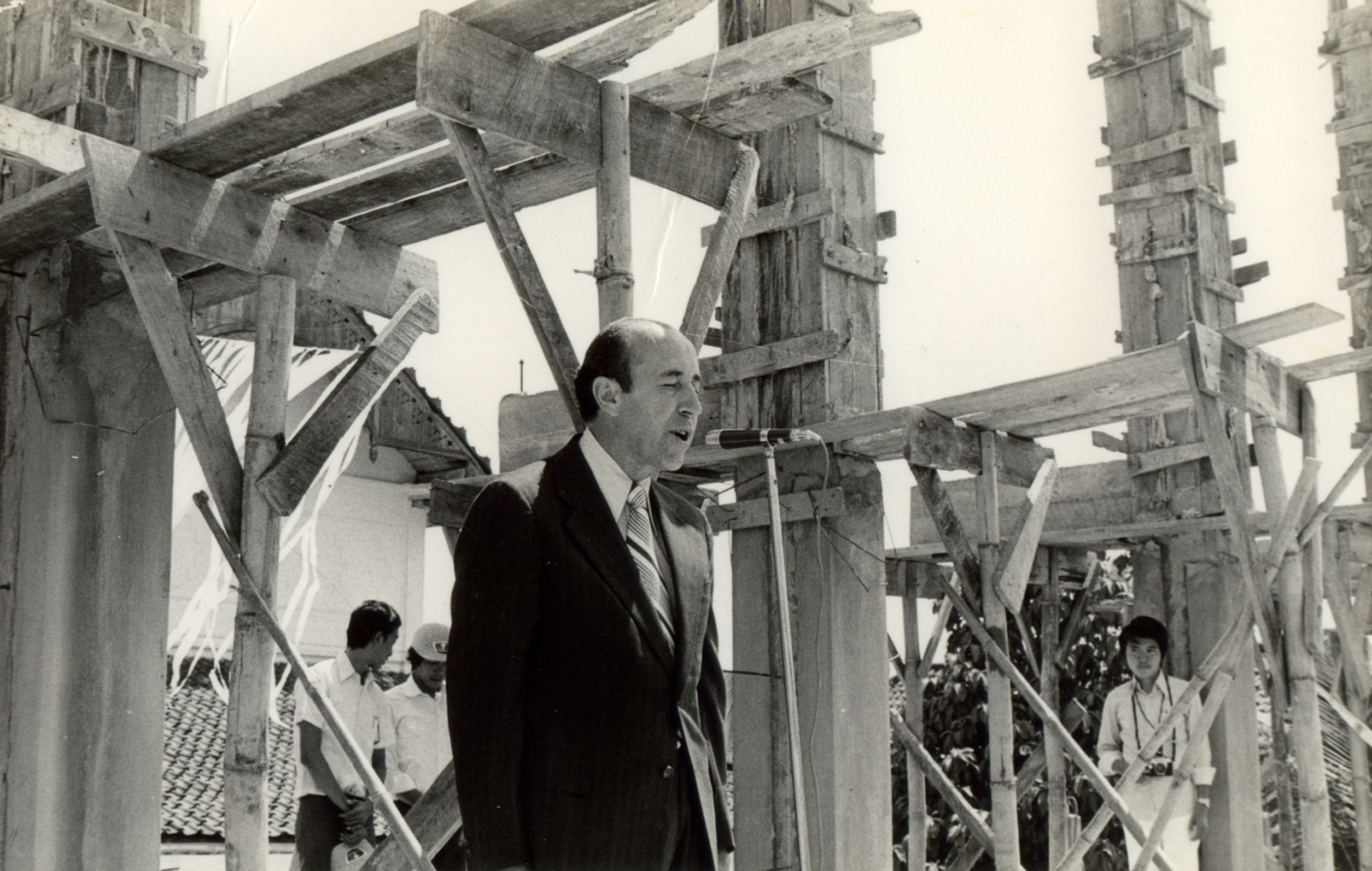 Dokumentasi peletakan batu pertama pembangunan gedung auditorium dan laboratorium Universitas Kristen Petra tanggal 26 Oktober 1973.