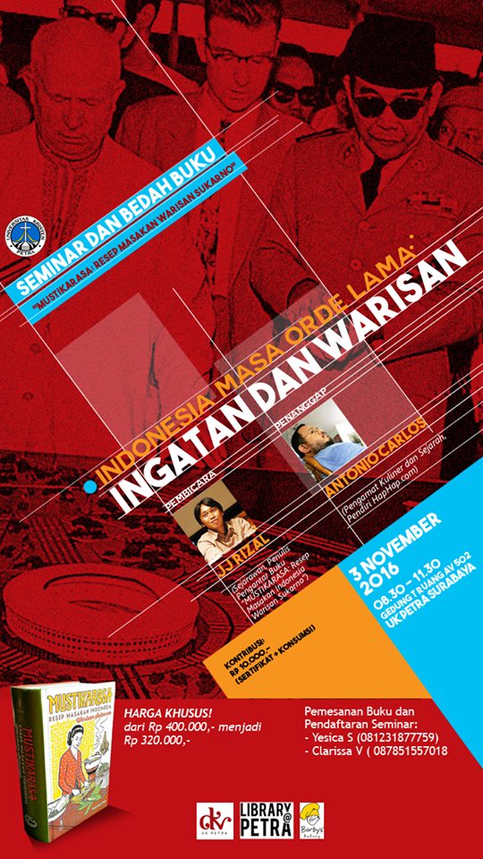 Seminar dan bedah buku "Indonesia masa orde lama" ingatan dan warisan" diadakn oleh Perpustakaan UK Petra bekerja sama dengan Progdi DKV. Acara ini diselenggarakan pada 03 November 2016 bertempat di gedung T. AV.502 UK Petra. Hadir sebagai Pembicara adalah J. J. Rizal dan sebagai penanggap adalah Antonio Carlos.