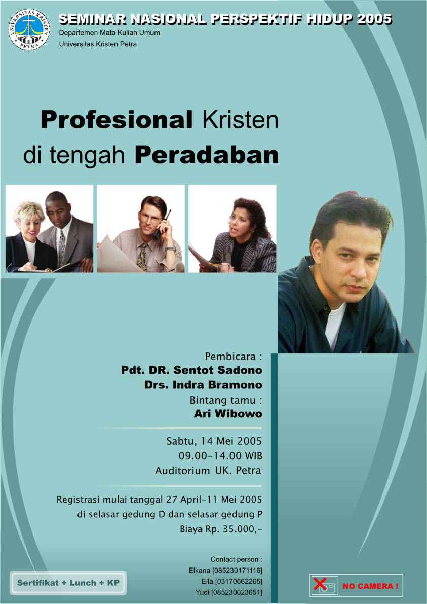 Seminar dengan bintang tamu aktor Ari Wibowo ini mengambil tema Profesional Kristen di Tengah Peradaban, diprakarsai oleh Departemen Mata Kuliah Umum Universitas Kristen Petra dan diselenggarakan pada tanggal 14 Mei 2005 bertempat di Auditorium UK Petra Surabaya. Tujuan seminar ini agar mahasiswa dibukakan wawasannya untuk menjadi seorang profesional dalam perspektif iman dan ilmu, dengan demikian dapat dirasakan perannya di tengah gereja, bangsa, dan negara. Di samping itu mahasiswa dapat menyadari panggilan dan tanggung jawabnya sebagai seorang profesional yang dapat berperan aktif menjadi stimulator bahkan transformator peradaban.