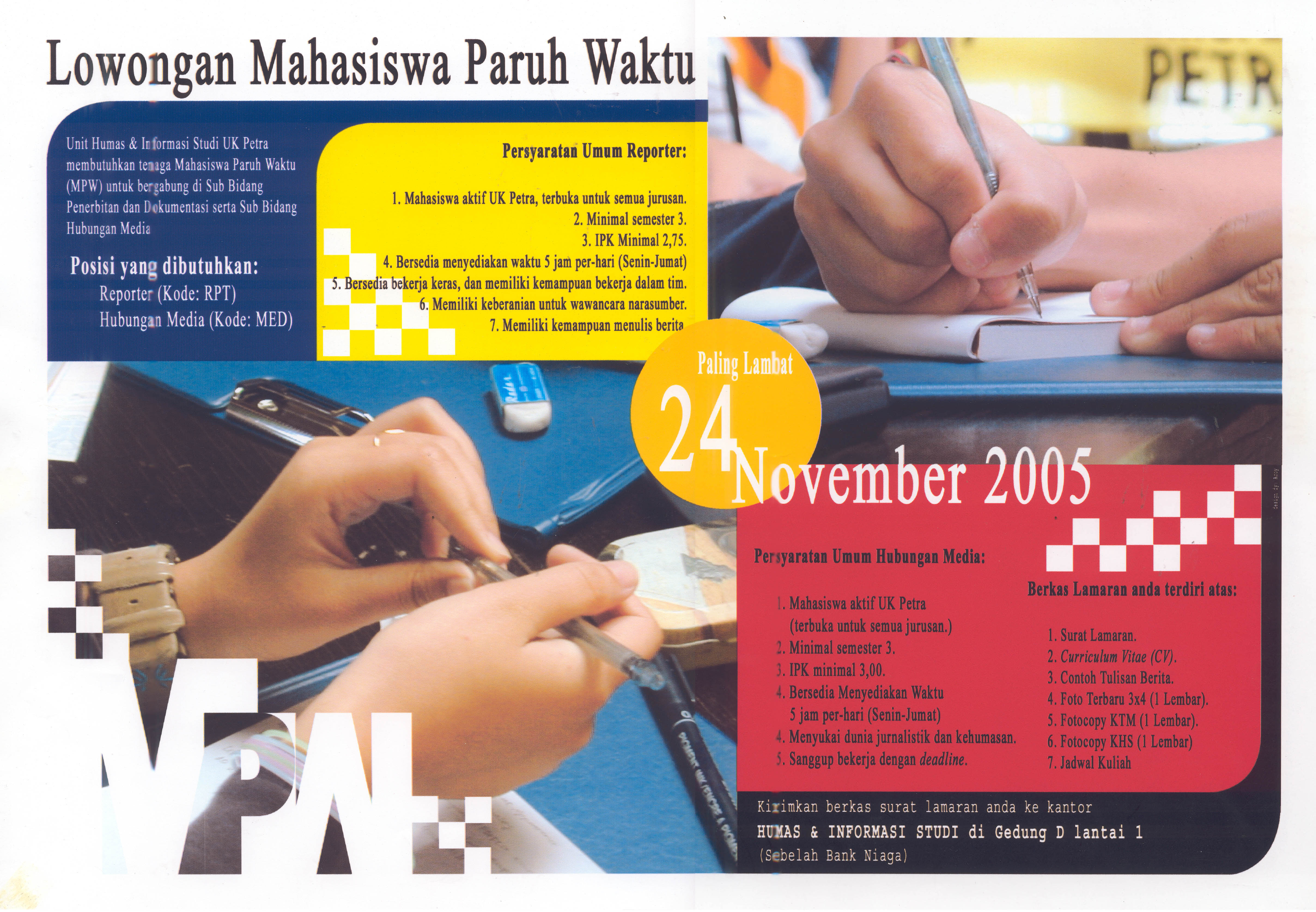 Poster ini menginformasikan adanya kesempatan bekerja paruh waktu bagi mahasiswa Universitas Kristen Petra di Unit Humas & Informasi Studi sebagai reporter dan hubungan media. Persyaratan umum reporter dan hubungan media juga dicantumkan dalam poster ini beserta batas waktu pengiriman surat lamaran.