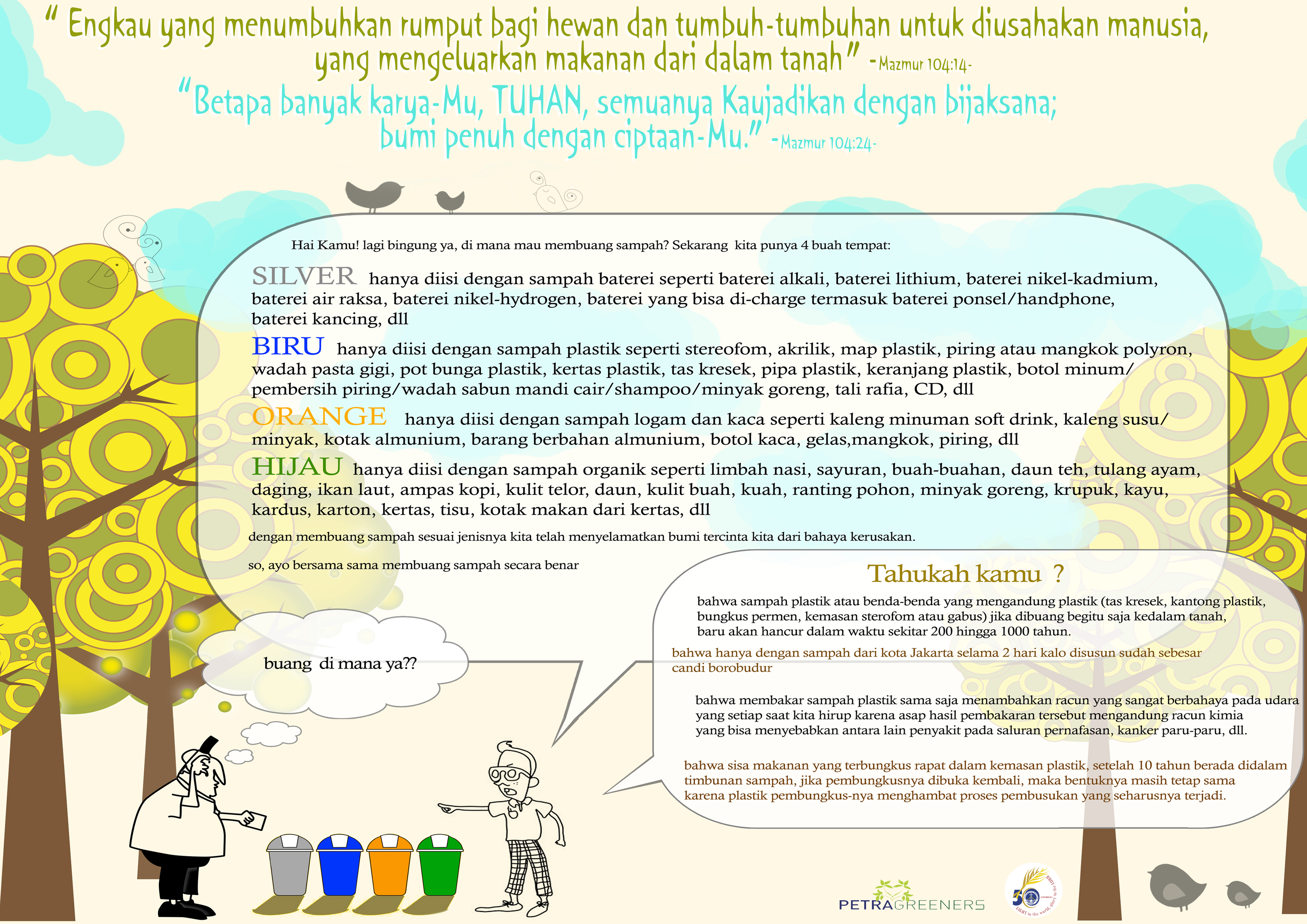 Dalam rangka menjadi Green Campus, Universitas Kristen Petra kini mempunyai 4 tipe tempat sampah yaitu tempat sampah berwarna silver, biru, orange dan hijau. Tempat sampah ini dibedakan menurut jenis sampah yang dibuang ke dalamnya. Dengan membuang sampah sesuai jenisnya kita telah menyelamatkan bumi tercinta dari bahaya kerusakan.