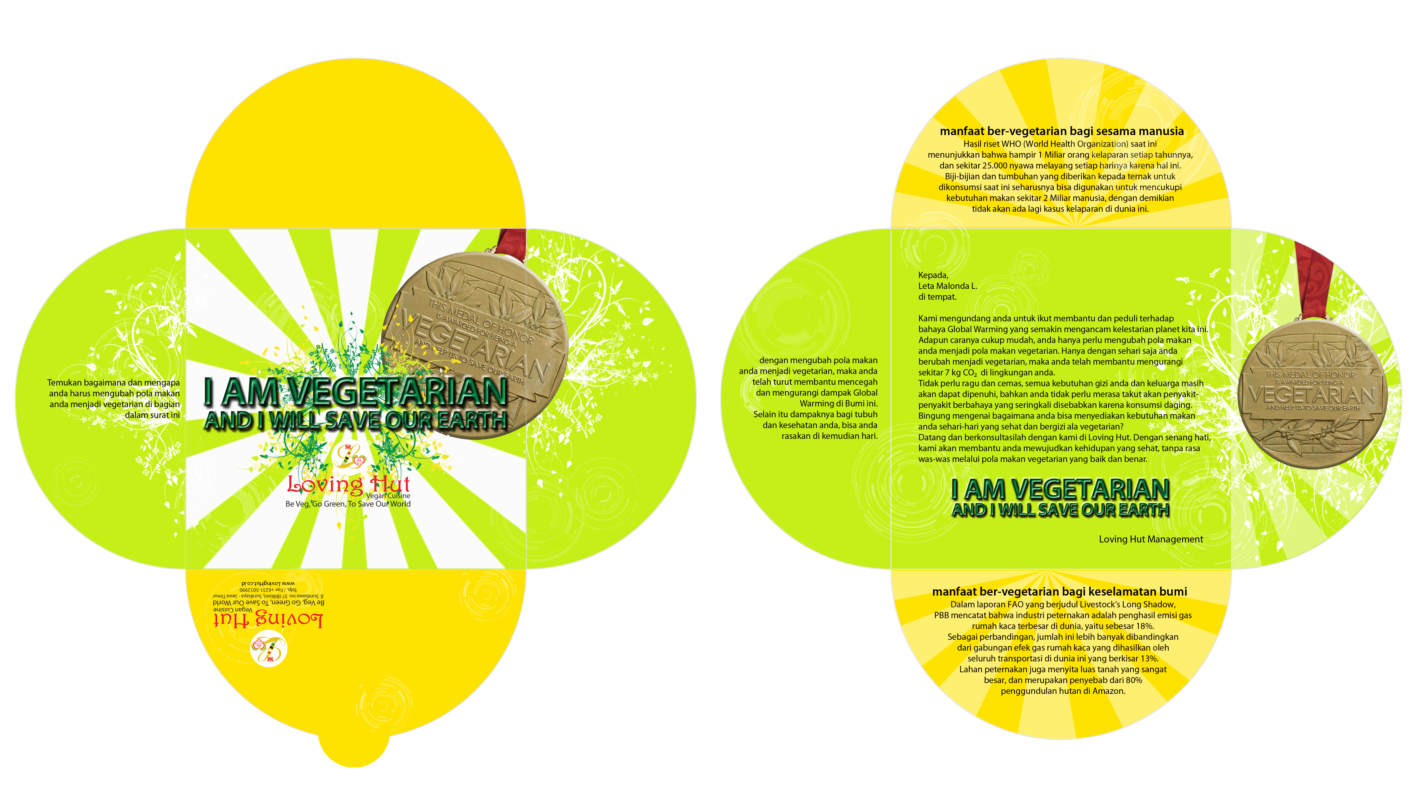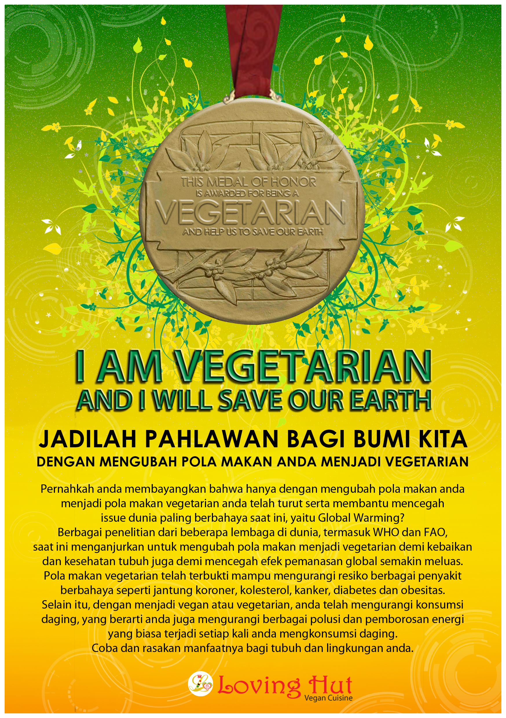 Loving Hut merupakan jaringan rumah makan yang khusus menyediakan berbagai variasi menu ala vegetarian. Visi misi yang unik dari restaurant ini, yaitu mengajak masyarakat awam mengubah pola makan menjadi vegetarian, memerlukan promosi agar visi misi tersebut dapat tertuang menjadi sebuah pesan yang dituliskan dalam berbagai media yang efektif dan tepat sasaran kepada target audience. Selain bertujuan untuk meneruskan visi misi tersebut kepada masyarakat luas, perancangan promosi ini juga bertujuan untuk memperkenalkan restaurant Loving Hut itu sendiri, khususnya kepada masyarakat Surabaya.