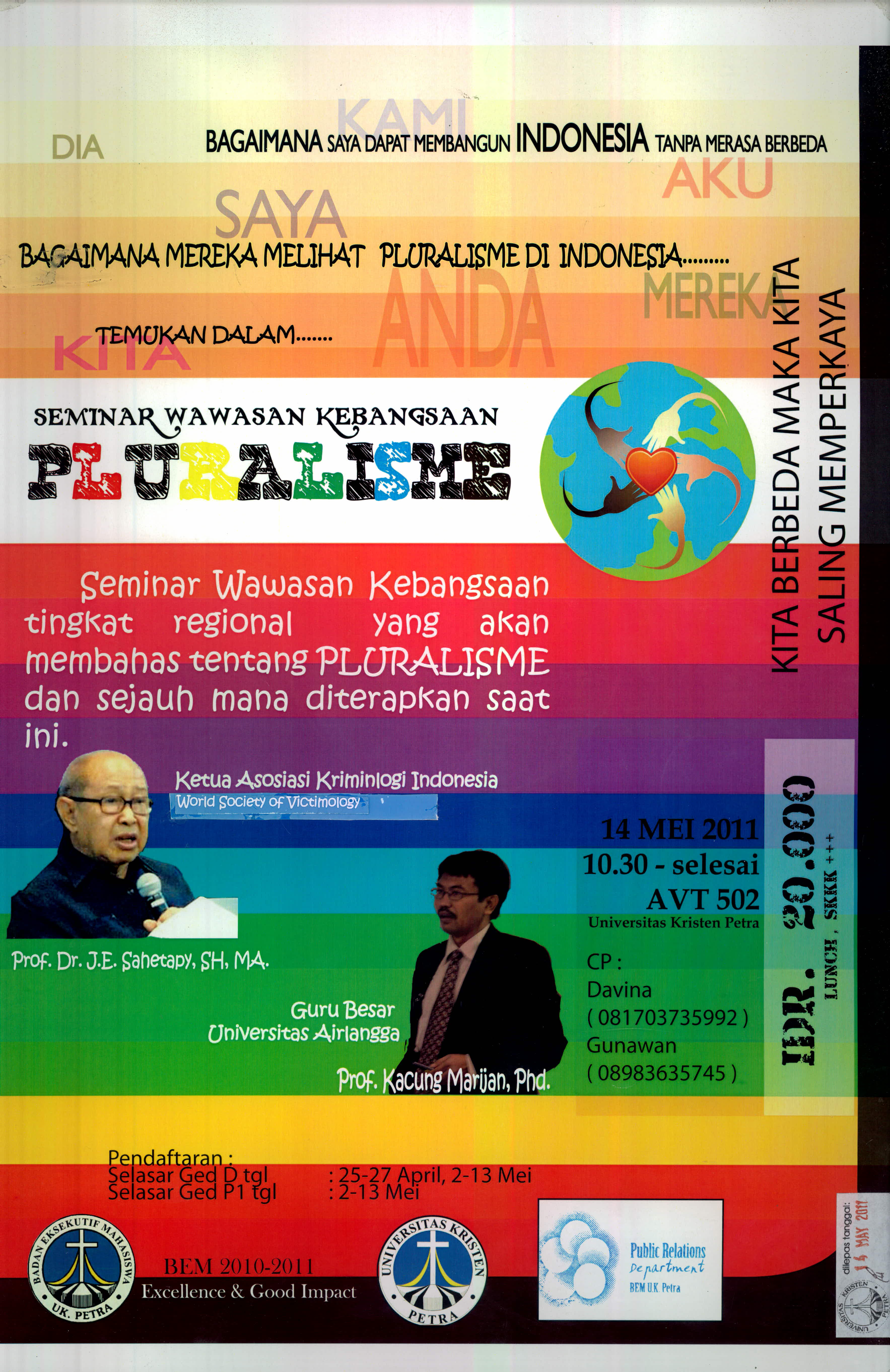 Public Relations BEM UK Petra mengadakan Seminar Wawasan Kebangsaan Pluralisme tanggal 14 Mei 2011. Pembicara yang dihadirkan yaitu Prof.Dr.J.E.Sahetapy, SH.,MA. dan Prof.Kacung MArijan, Ph.D. Seminar ini merupakan smeinar wawasan kebangsaan tingkat regional yang akan membahas mengenai pluralisme dan sejauh mana diterapkan saat ini.