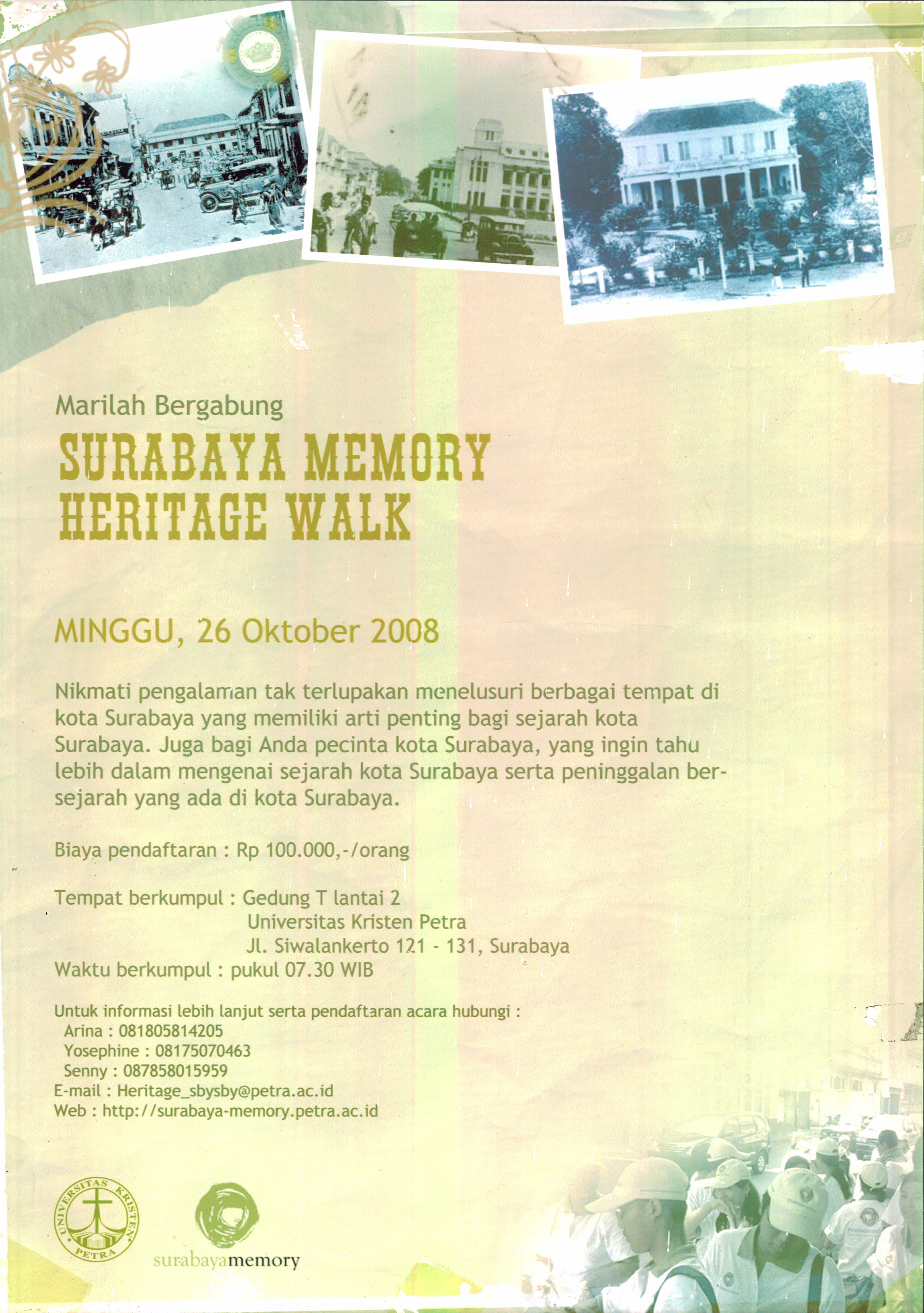 Surabaya Memory Heritage Walk dilangsungkan pada tanggal 26 Oktober 2008. Surabaya Memory Heritage Walk ini menelusuri berbagai tempat di kota Surabaya yang memiliki arti penting bagi sejarah kota Surabaya. Bagi para pecinta kota Surabaya juga dapat lwbih dalam mengenal sejarah kota Surabaya serta peninggalan bersejarah yang ada di kota Surabaya.