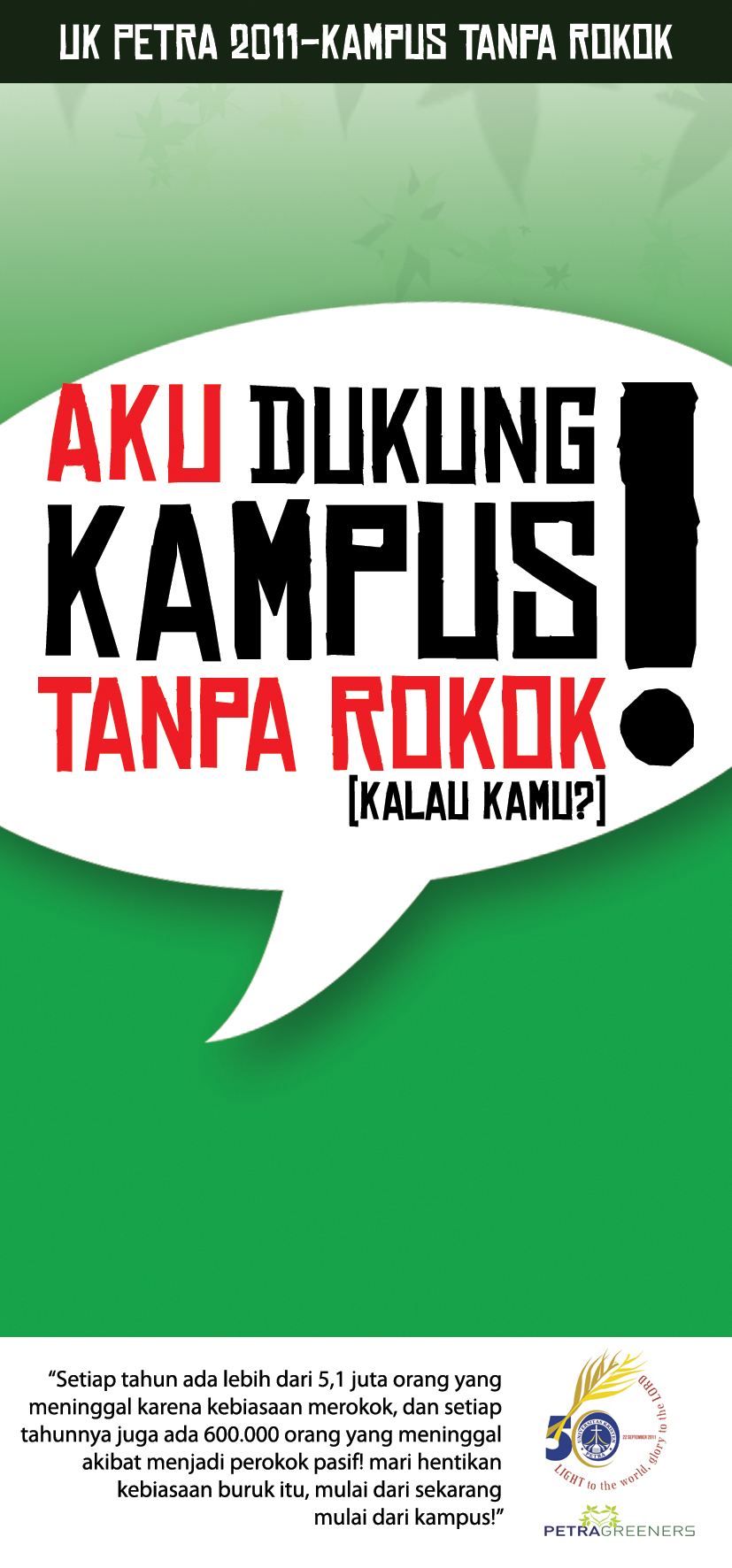 UK Petra 2011 adalah kampus tanpa rokok. Setiap tahun ada 5,1 juta orang meninggal karena merokok, dan sebanyak 600.000 orang meninggal karena jadi perokok pasif. Oleh karena itu hentikan kebiasaan merokok.