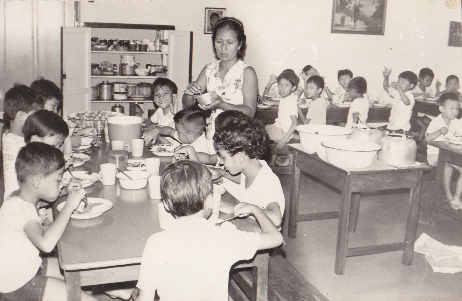 Seorang pengasuh anak sedang melayani anak-anak dari Kelompok Asuh bagian anak TK dan SD pada waktu makan siang bersama di ruang makan panti, tahun 1980.