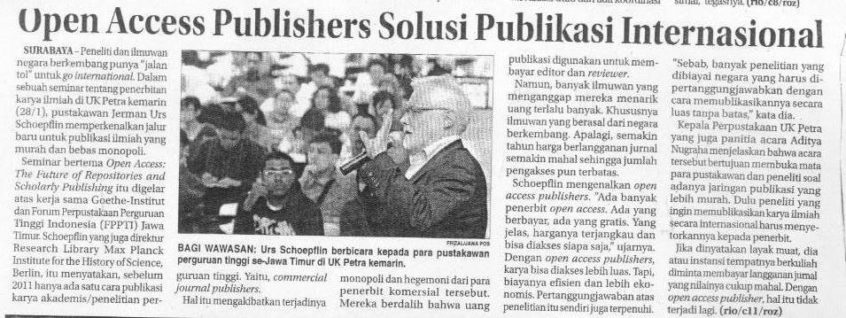 Dalam sebuah seminar tentang penerbitan karya ilmiah UK Petra tanggal 28 Januari 2013, pustakawan Jerman Urs Schoepflin memperkenalkan jalur baru untuk publikasi ilmiah yang murah dan bebas monopoli. Seminar bertema "Open Access: The Future of Repositories and Scholarly Publishing" itu digelar atas kerjasama Goethe-Institut dan Forum Perpustakaan Perguruan Tinggi (FPPTI) Jawa Timur.