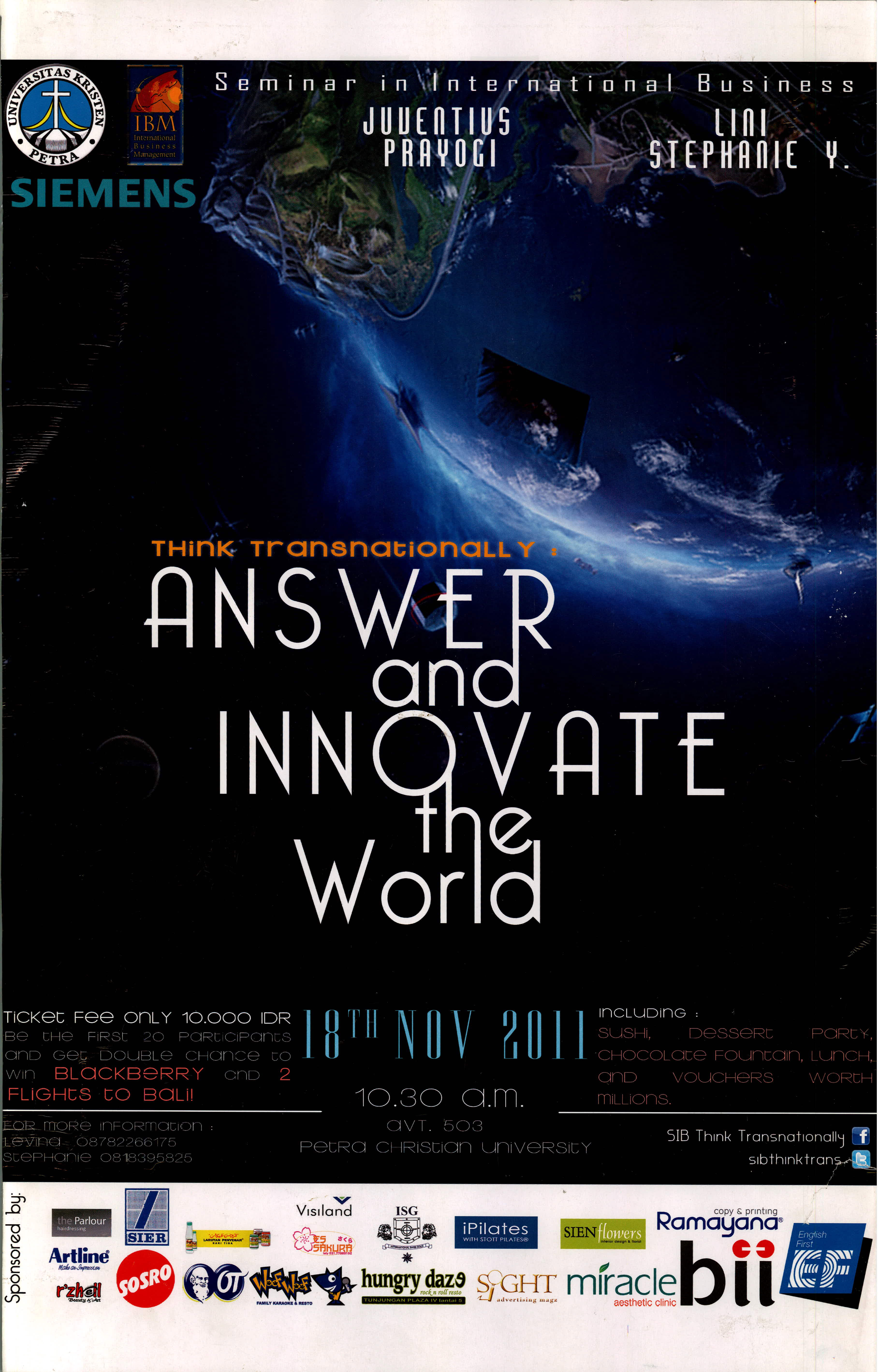 Program Studi International Business Management UK Petra mengadakan seminar in International Business Management bertema "Think Transnationally: Answer and Innovate the World" pada tanggal 18 November 2011. Dengan menghadirkan Juventius Prayogi dan Lini Stephanie Y. sebagai pembicara.