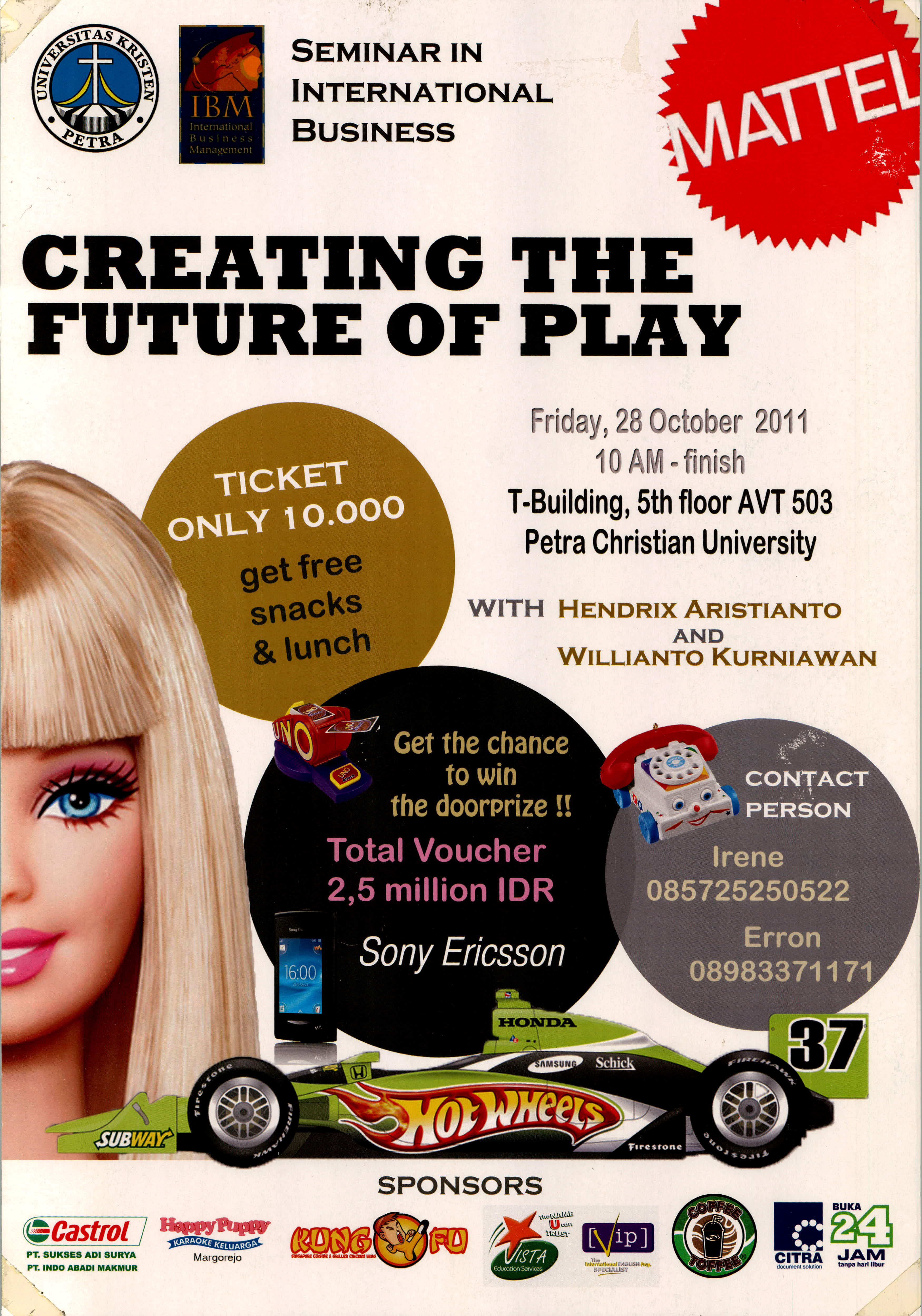 Program Studi International Business Management mengadakan seminar in International Business mengadakan seminar dengan tema "Creating the Future of Play" pada tanggal 28 Oktober 2011 bertempat di Gedung T lt.5 bersama Hendrix Aristianto dan Wiilianto Kurniawan.