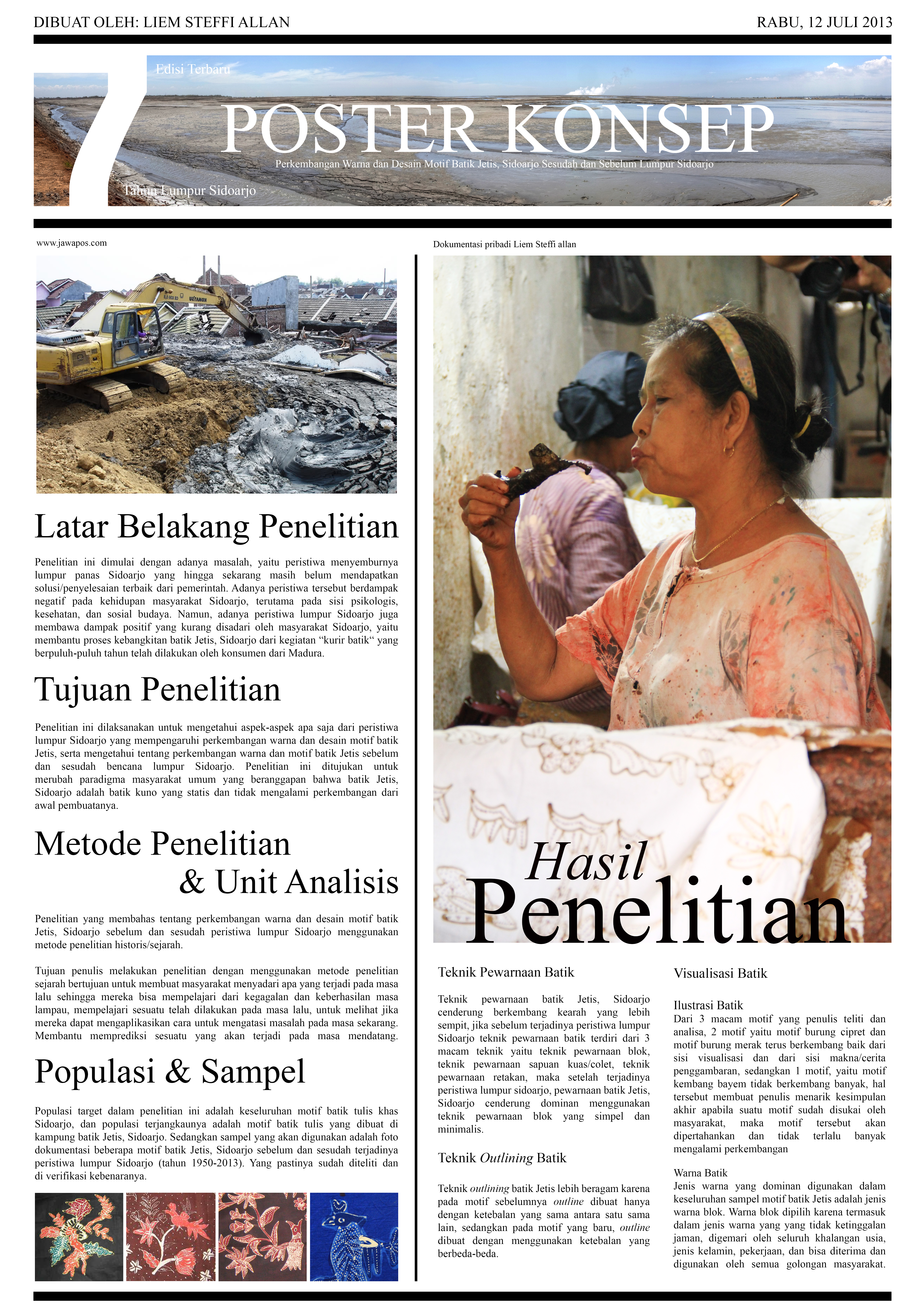 Adanya peristiwa lumpur Sidoarjo membawa dampak positif yaitu membantu proses kebangkitan batik Jetis, Sidoarjo dari kegiatan “kurir batik“ oleh konsumen dari Madura. Dengan menggunakan metode penelitian sejarah/historis dan unit analisis data kualitatif penelitian ini dilaksanakan untuk mengetahui aspek-aspek apa saja dari peristiwa lumpur Sidoarjo yang mempengaruhi perkembangan warna dan desain motif batik Jetis, serta mengetahui tentang perkembangan warna dan motif batik Jetis sebelum dan sesudah bencana lumpur Sidoarjo. Kesimpulan yang dapat diambil dari penelitian ini adalah telah terjadi perkembangan warna dan desain motif batik Jetis, Sidoarjo sebelum dan setelah terjadinya peristiwa lumpur Sidoarjo.