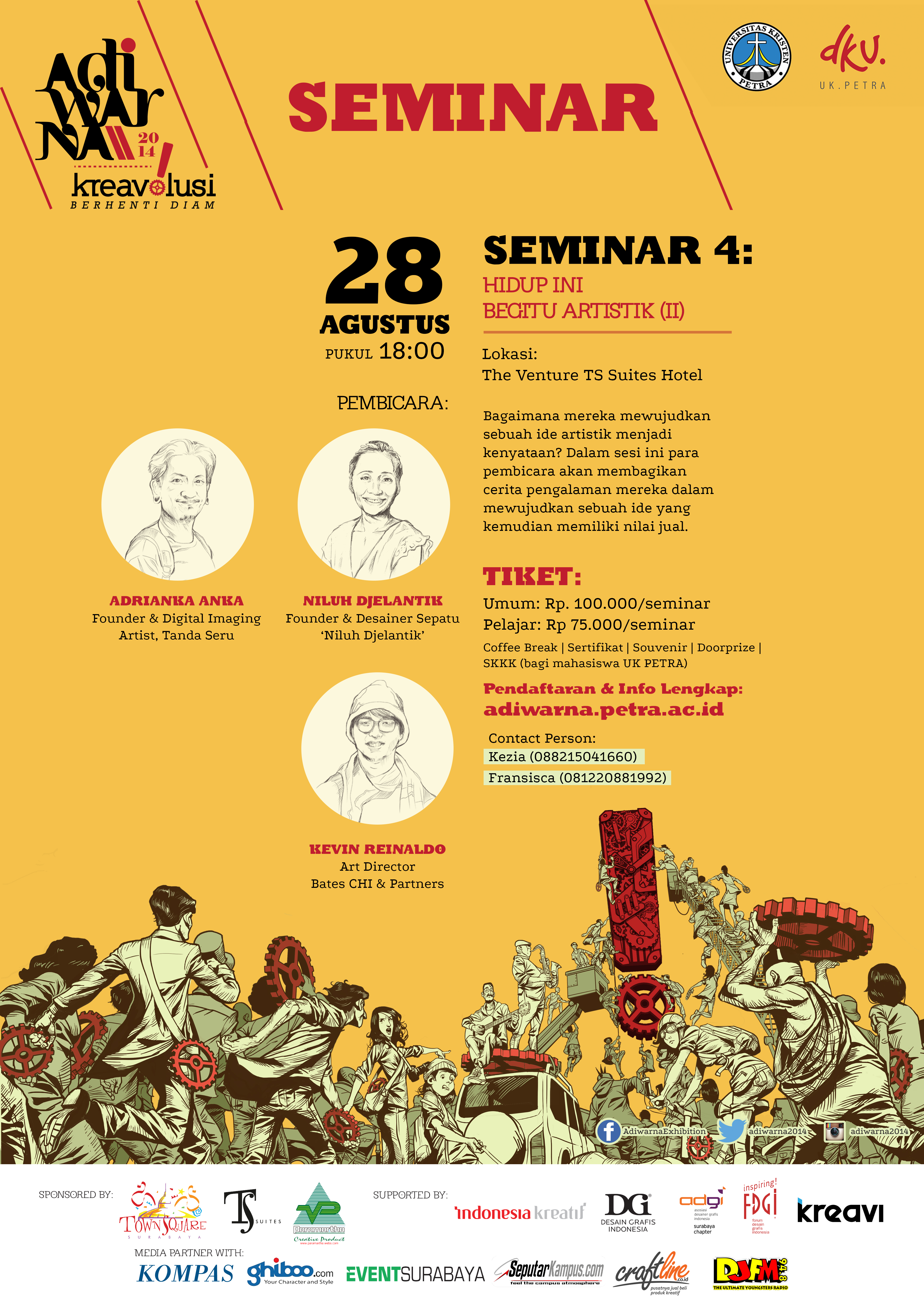 Adiwarna 2014 mengadakan seminar kedua yang dilaksanakan pada 27 Agustus 2014 pukul 18.15 WIB, dengan tema “Superhero di Sekitar Kita”. Seminar ini menghadirkan beng Rahadian dan Is Yuniarto sebagai pembicara. Seminar Adiwarna 2014 ini dikenakan biaya tiket sebesar Rp 100.000 untuk umum dan Rp 75.000 untuk pelajar. Pendaftaran dan info lengkap dapat diakses melalui adiwarna.petra.ac.id.