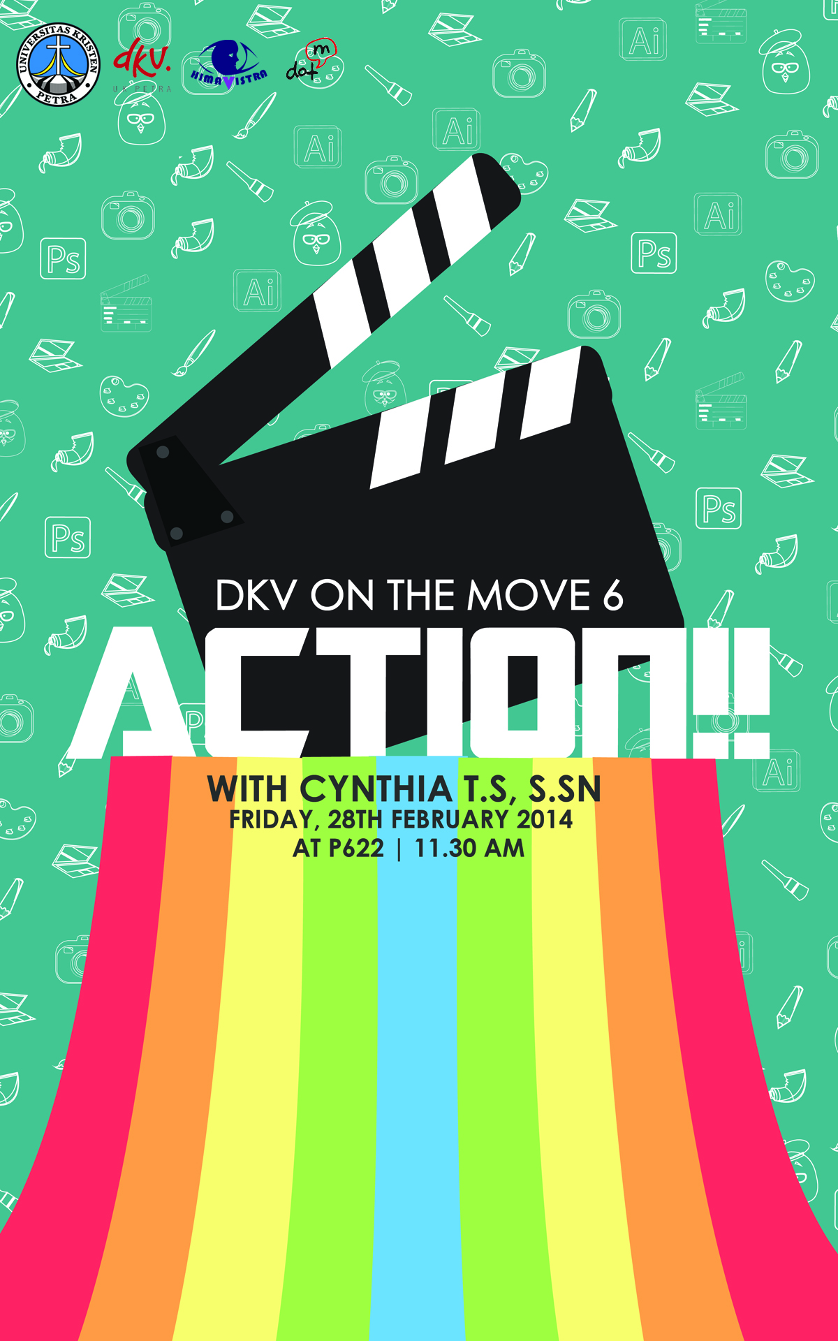 Persekutuan jurusan DKV dengan tema Action yang akan dibawakan oleh Cynthia T.S, S.Sn pada hari Jumat, 28 Februari 2014 pukul 11.30 WIB bertempat di AT P.662 UK Petra