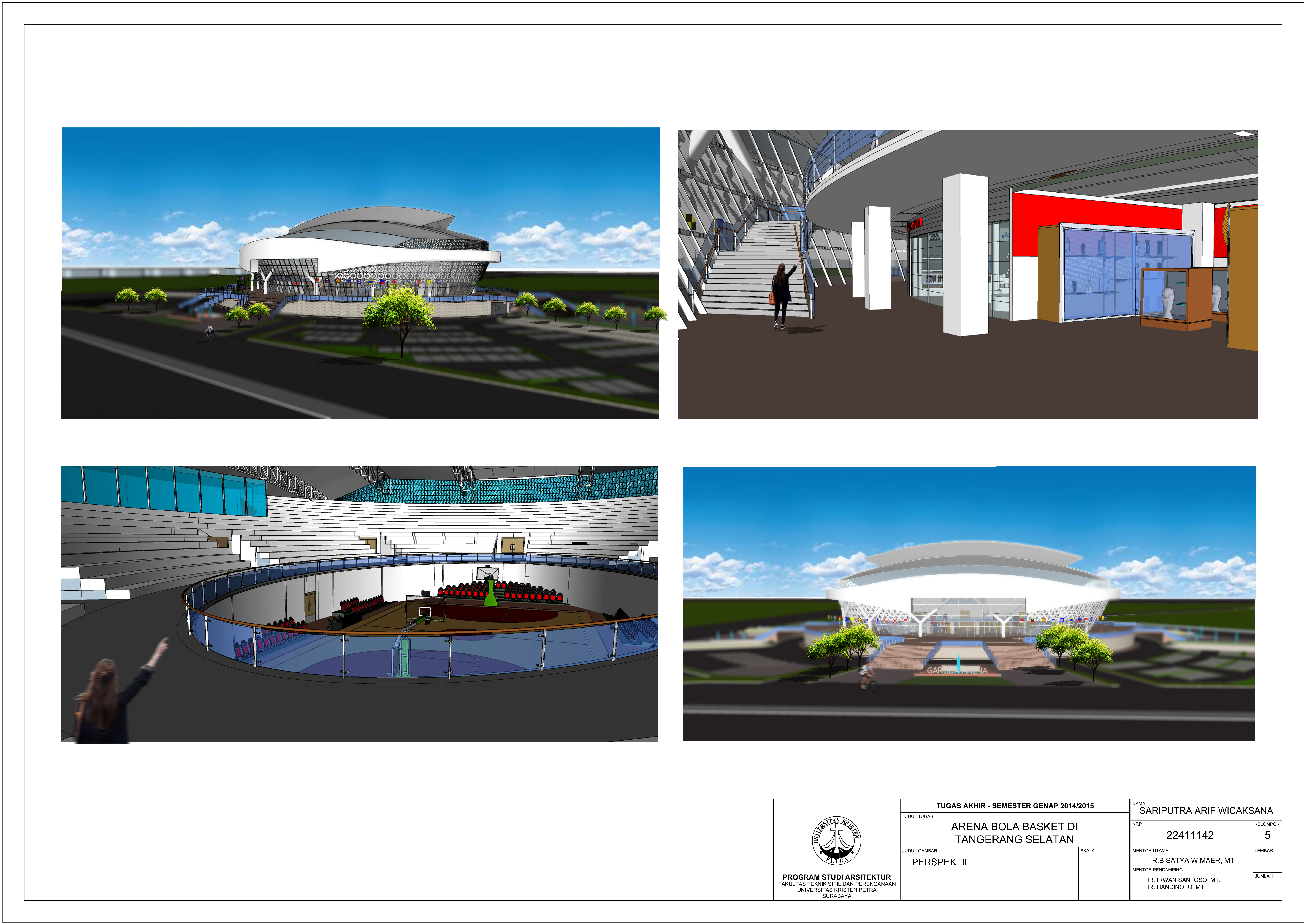 terbuka yang dapat digunakan sebagai ruang publik. Fasilitas pertandingan ini juga didukung oleh fasilitas-fasilitas seperti fasilitas retail, fasilitas restaurant & cafe, fasilitas toko olahraga, fasilitas galeri, dan fasilitas-fasilitas penunjang bagi pemain seperti, ruang ganti, dan ruang fisioterapi. Penggunaan unsur-unsur lokalitas pemberi kesan tentang Indonesia dirancang pada bagian facade yang terinspirasi dari pattern batik. Bentuk atap pada proyek ini juga mengambil unsur lokalitas yang berawal dari bagaimana memasukkan udara pada atap tradisional menjadi memasukan cahaya. Dalam merancang fasilitas ini digunakan pendekatan di mana sistem-sistem, seperti sistem parkir, sistem sirkulasi, sistem utilitas, sistem struktur dan sistem cahaya di tata dengan baik. Sistem cahaya dan sistem struktur digunakan untuk menjawab permasalahan